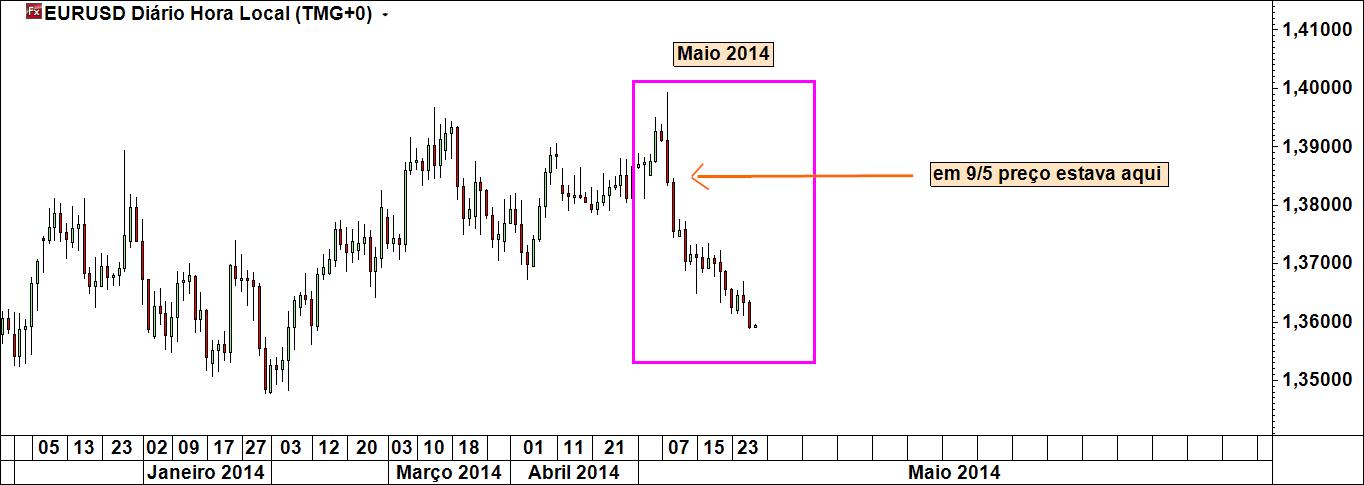 No dia 9 de Maio falei aqui de uma certa sazonalidade do eurusd. Para sustentar a ideia coloquei vários gráficos diários referentes aos anos de 2011, 2012 e 2013 (de momento não interessa saber se são em número suficiente para ser algo "estatisticamente relevante", pois não é disto que se trata). Como nos aproximamos do fim do mês está na altura de actualizar o gráfico (referente a este ano), nele se destacando o local onde o preço se encontrava naquela data.