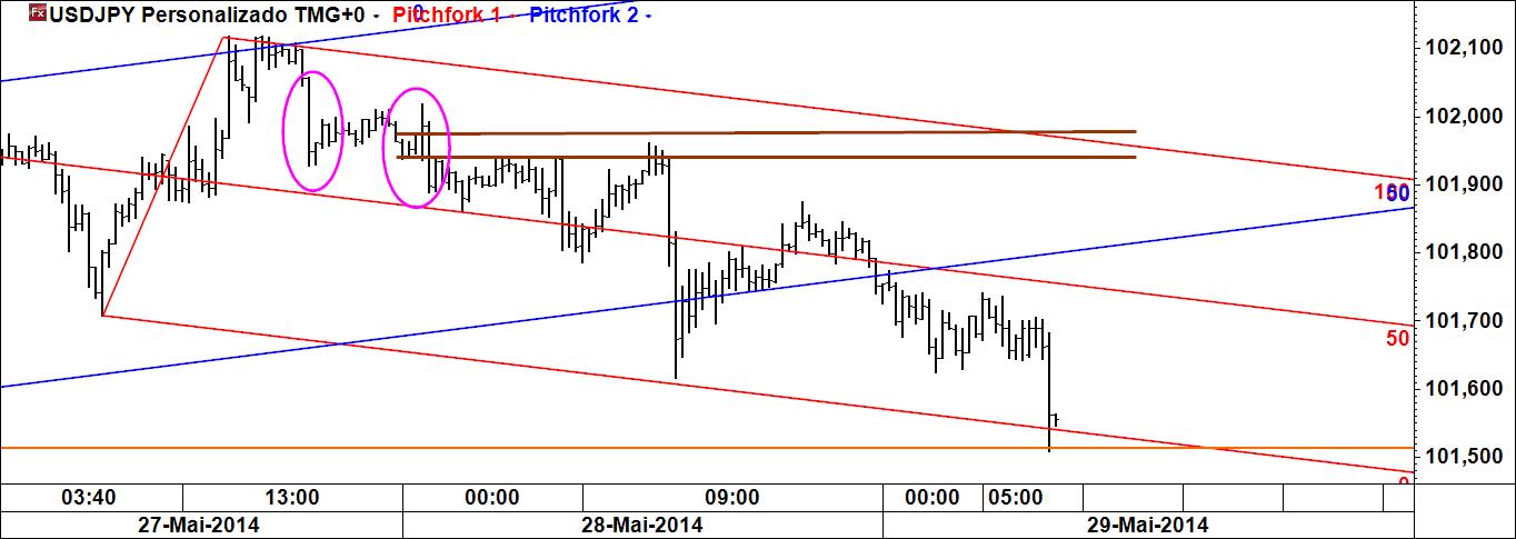 Quem, como eu, tem por hábito circunscrever a atenção a um conjunto predeterminado de mercados (só assim se poderá começar a ganhar a intimidade necessária ao conhecimento das matreirices de cada um deles), tem de ter especial cuidado com o modo como faz os seus desenhos nos respectivos gráficos. É que facilmente se fica preso à leitura que se tenha feito numa 2.ª feira à noite e entretanto já chegámos à 5.ª feira. Assim, e por exemplo, se naquela data se equacionava um certo tipo de negócio, pode suceder que a evolução do preço venha entretanto mudar a configuração do mercado. Ora, se nos mantivermos fiéis às linhas que de início desenhámos, não só ficamos fechados a outras oportunidades, como passamos grande parte do tempo à espera que o mercado faça aquilo que queríamos que fizesse (que bata nas linhas ou chegue às zonas) e não conseguiremos detectar que ele assim não irá fazer, pelo menos do modo previamente suposto (ex. chegar com certa velocidade a certo nível, em certa data, etc.). A situação torna-se cada vez mais grave quanto menor for a escala temporal usada, dado que pelo mero decurso do tempo uma linha ou uma zona rapidamente são ultrapassadas. A única solução para este problema é apagar tudo e começar de novo. Eis pois um novo gráfico do usdjpy a 20 m, onde se poderá ver que o mercado está em fase descendente (lembre-se que se tinha vindo a perseguir uma compra). A fraqueza do preço é evidente na medida em que, depois de ter quebrado a linha média inferior do fork, não fez o teste (switchback) e dela tem vindo a afastar-se e entretanto fez um novo mínimo. Teremos pois uma oportunidade especulativa vendedora.