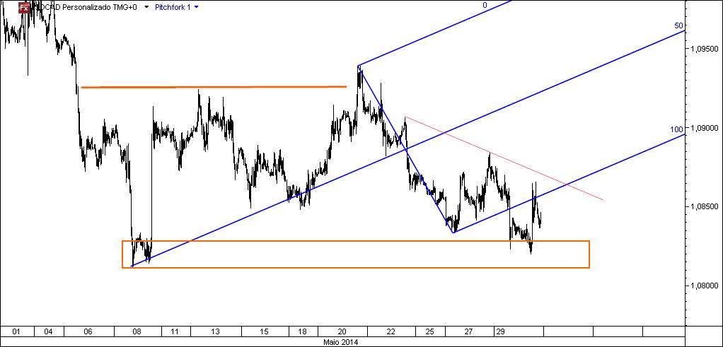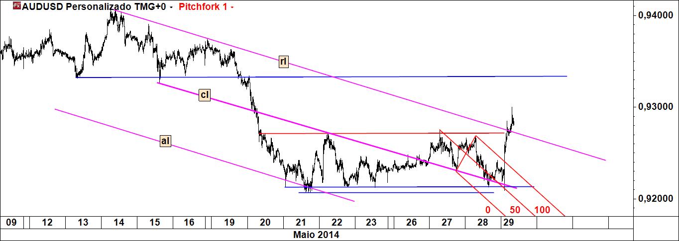 Como já tive oportunidade de referir noutras ocasiões, nem sempre as linhas fornecem protecção para colocação da stoploss, sejam elas quais forem e ainda que estejam rodeadas das mais belas probabilidades. Serve isto para fazer ver que, no contexto do eventual negócio executado naquele par cambial, o "segredo" para ainda não termos sido stopados reside no lugar onde aquela foi colocada. Agora, se a estrutura escolhida será suficiente para aguentar a corrente fase descendente do preço é algo que não se pode saber de antemão, mas uma coisa me parece evidente: não faltará muito para se saber se se aguenta ou não (é agora que os compradores terão de aparecer para protecção da zona). Se a coisa quer efectivamente subir, então é preferível que o preço volte a gostar da linha média inferior do fork e "salte para cima dela" com todo o vigor.