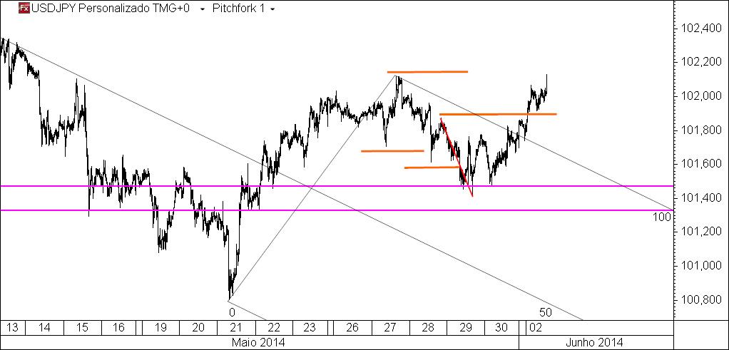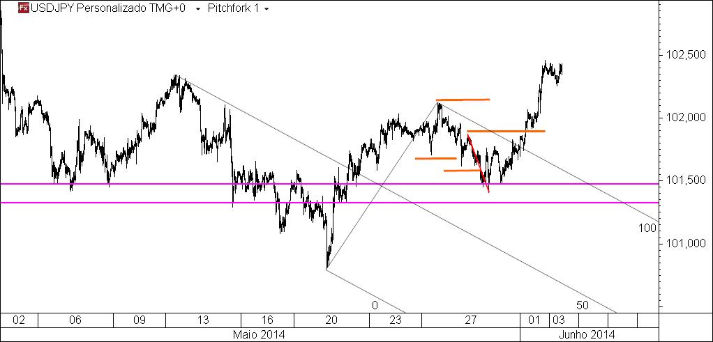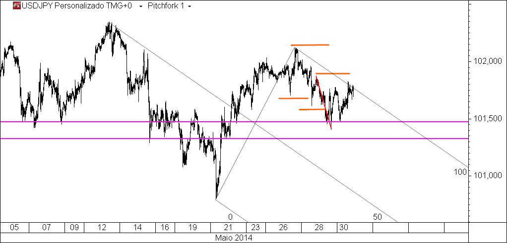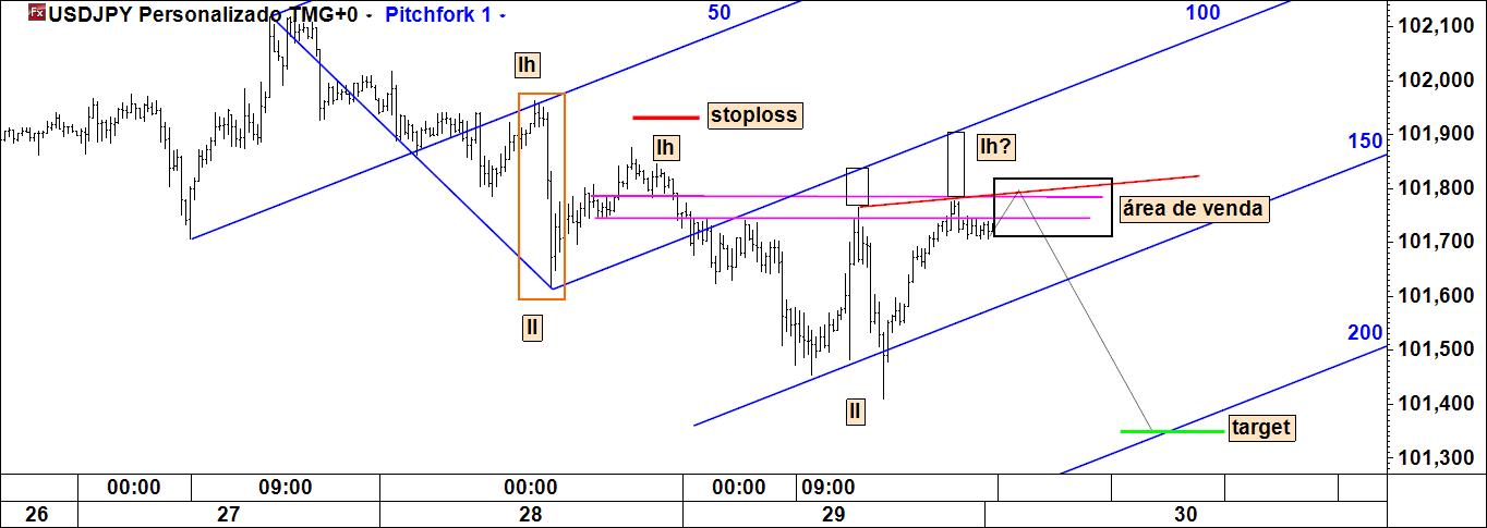 usdjpy 20 m: o preço aproxima-se de uma área de interesse para uma oportunidade especulativa compradora e pelo caminho não nos deu a oportunidade vendedora que também se havia assinalado.