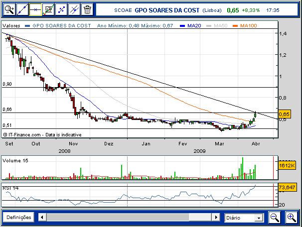 É claro que não. Quem anda a comprar, terá as suas razões para fazê-lo. Por mim, chega de Soares da Costa. Tinha-as a 0,55 (preço médio) e entendi chegado hoje o momento de largá-las (infelizmente) a 0,74. Isto porque, para além do sobreaquecimento, ter batido numa LTDmp e duvidar que fosse capaz de quebrá-la em fecho. Assim sendo, vamos ver como reagirá nos próximos tempos.