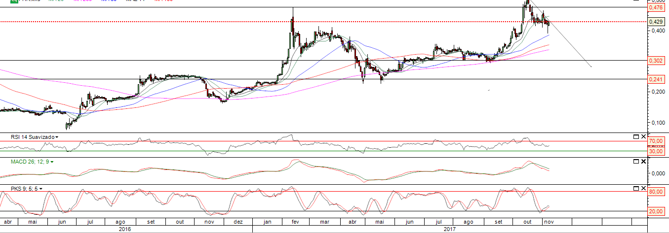 Mas olhei agora e a tendência no curto prazo ate e descendente e não para cima , está a cair desde os 0.50 e está aparentemente aqui a testar um suporte nos 0.43, com potencial duplo topo, e até pode vir a desenvolver aqui um potencial H&S coxo