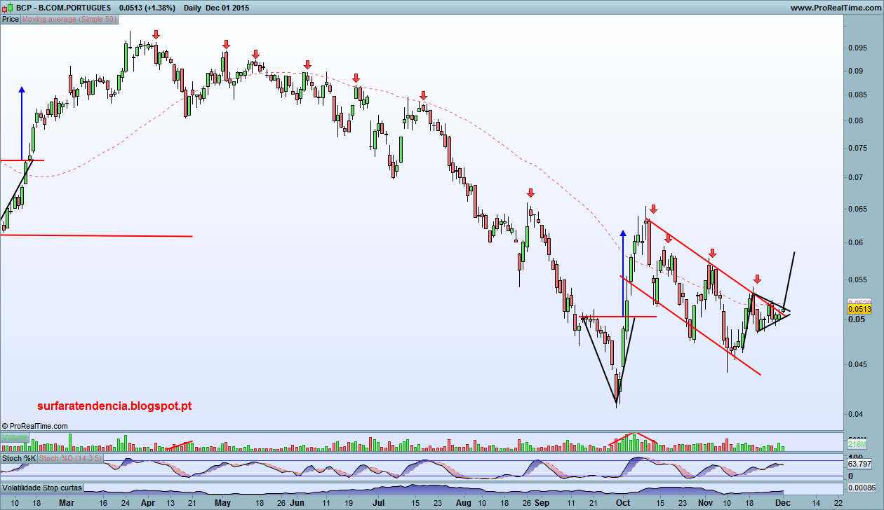 tiagopt2 Escreveu:A análise ao BCP levar-nos-á novamente a percorrer um cenário de esperança e incerteza. Começando pelas más notícias, a força ascendente do título não tem sido suficiente para quebrar a sequência de lower-highs que se arrasta desde Abril. São, a olho, 11 consecutivos. É incorrecto considerar que a tendência do BCP deixou de ser descendente numa óptica de médio prazo enquanto esta sequência se mantiver inalterada. Por outro lado, e ao contrário do que se passa no BPI (onde o movimento descendente tem aspecto de consolidação), neste caso tudo indica que estaremos perante um canal paralelo descendente. O número de toques nos extremos ultrapassa o que seria expectável para um padrão de consolidação... A somar a isso, temos o preço a encostar a uma zona de alguma resistência, o que pode gerar um movimento descendente.