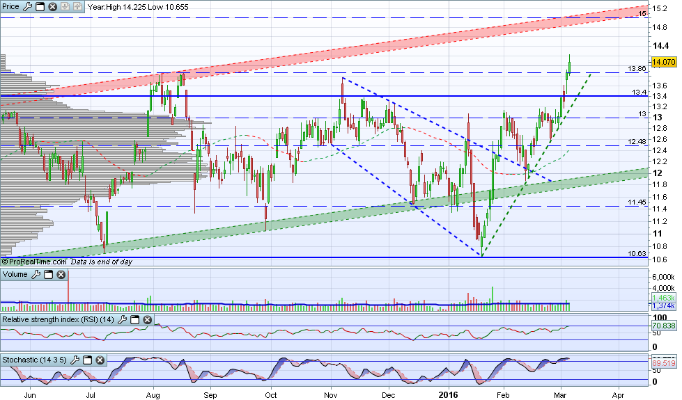 Razão pela qual acredito que a resistencia dos 13,80€ provoque uma ligeira correcção, mas quando se atingir um maximo relativo perto do valor psicologico dos 14€