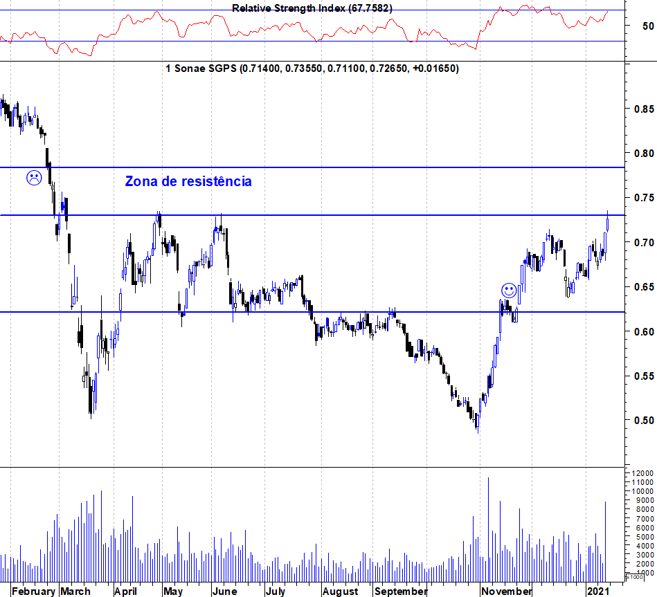 Não é a acção com mais peso do PSI, mas normalmente é a mais importante como barómetro da Bolsa portuguesa. E, na verdade, a situação técnica da Sonae reflecte um pouco o actual momento do nosso mercado. A Sonae deu ali um sinal de força com a quebra da resistência dos 0,62 euros. As próximas semanas vão ser interessantes pois, se por um lado, é importante que continue a manter-se acima desse novo suporte dos 0,62, por outro lado seria um enorme sinal quebrar a zona de resistência entre os 0,74 e os 0,78 euros.