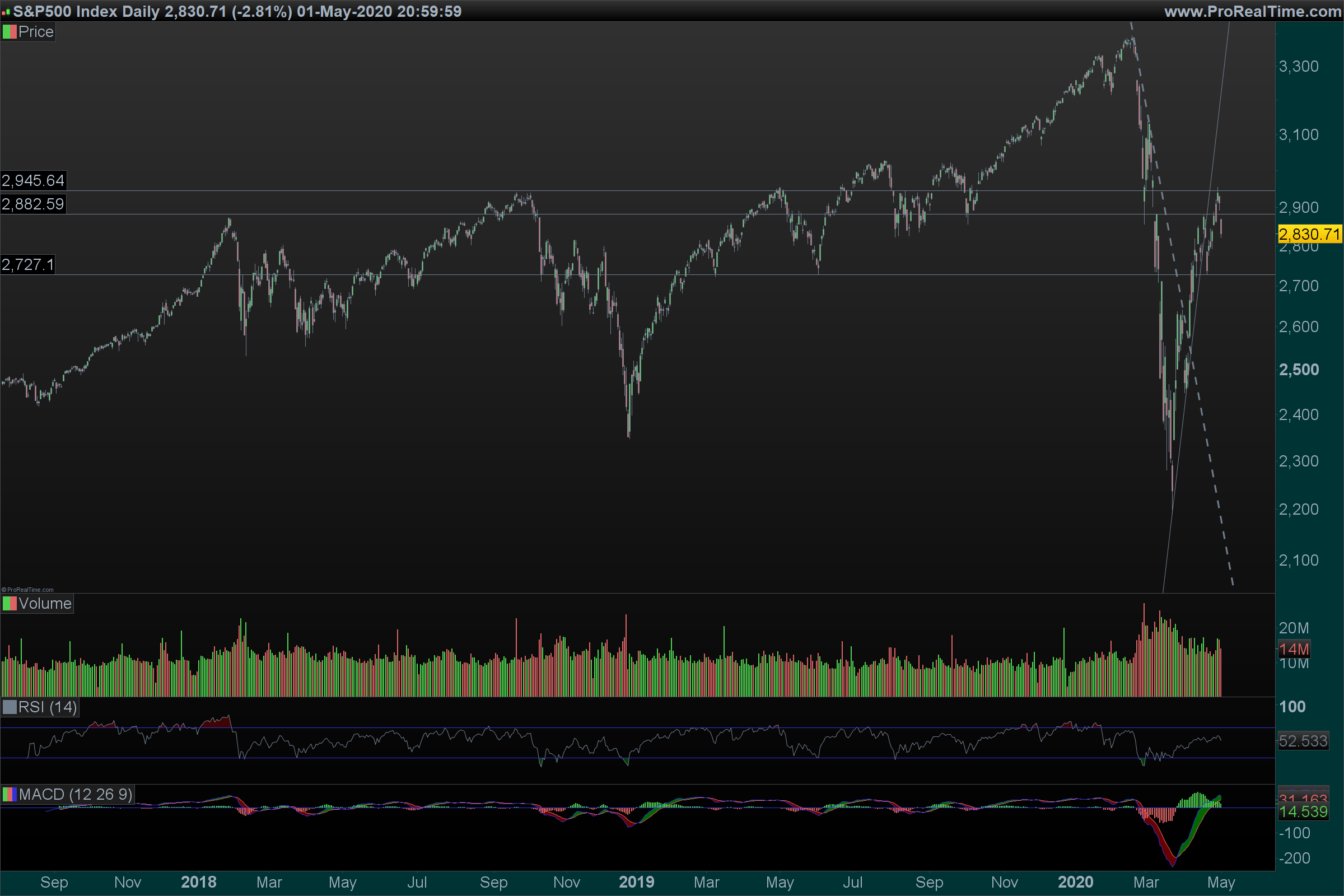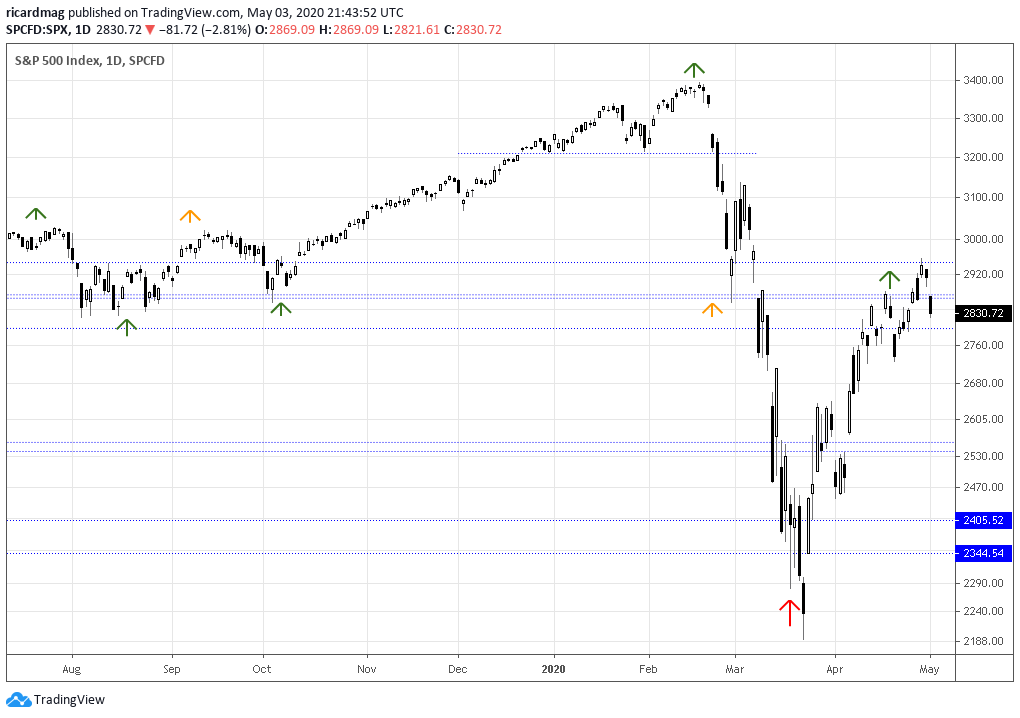 Para os grandes planos, investimentos de médio-prazo, recorro aos gráficos. Avalio principalmente as zonas de suporte e resistência, e olho para as médias corriqueiras, 20, 50, 200. Neste tipo de negócio somente utilizo ETF's. Nomeadamente o faço para 2 indices (SPX, e Russel 2000, neste último mais raramente). Mas considero-o um excelente farol.