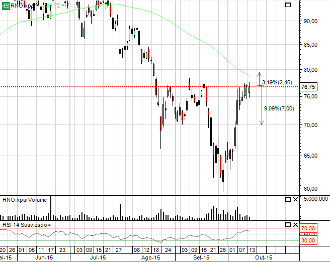 Estou curto na Renault a 77€. Stop a 79,5€ e objetivo a 70€. Relação risco/ganho de 1-3.