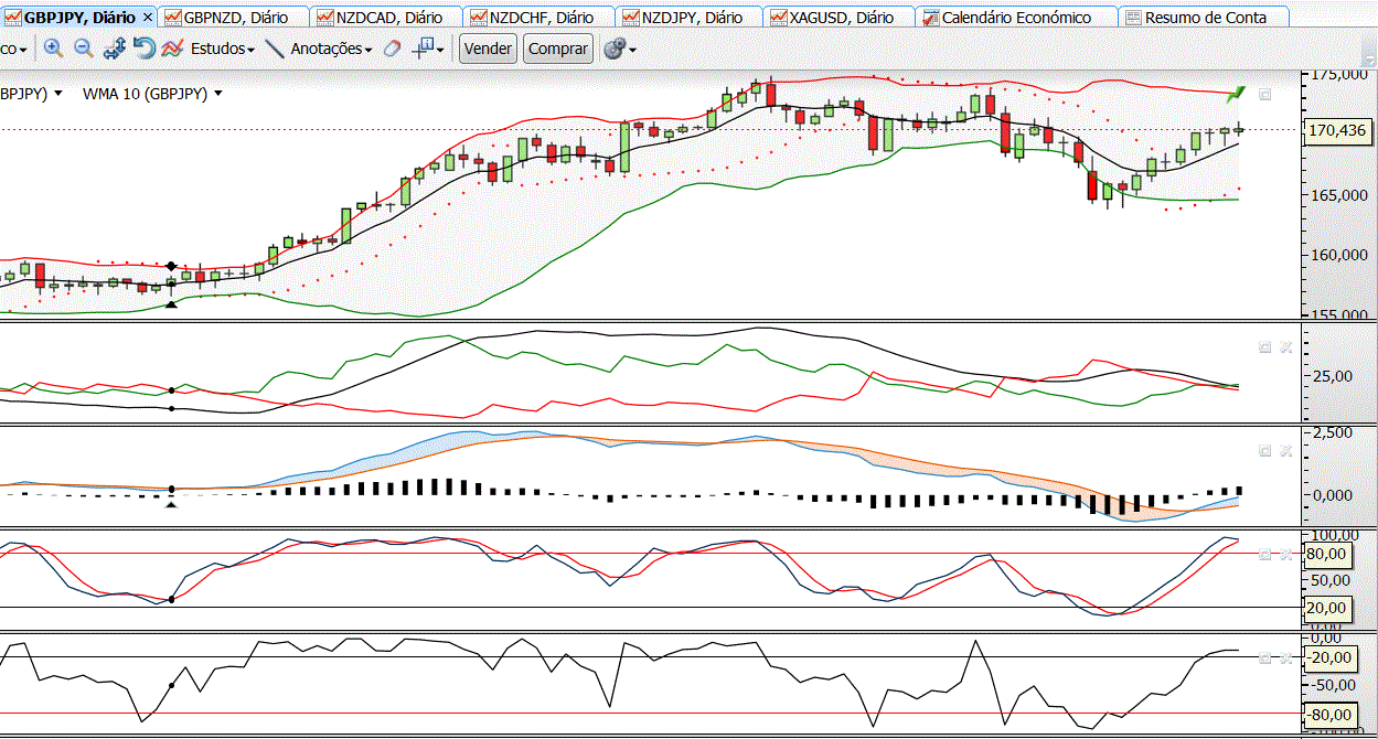 3 - Embora ainda não tenha ultrapassado em baixa a última vela de referência, os indicadores oscilatórios parecem indicar uma inversão de tendência de curto prazo favorável à abertura de posição curta.