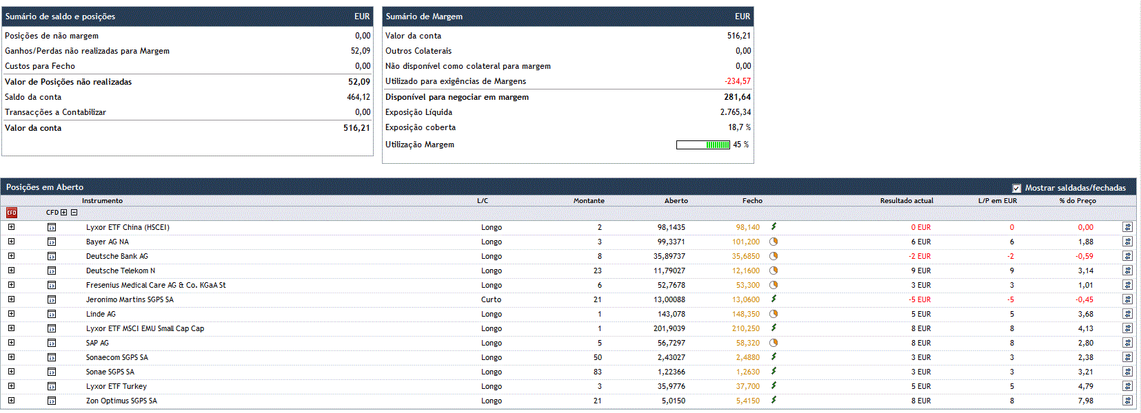 As posições em CFD´s de acções variam entre € 150 e € 300, respectivamente, em função da alavancagem, excluindo os CFD´s de índices (que neste momento não tenho em carteira) que variam sensivelmente entre os € 2.500,00 e € 3.500,00.