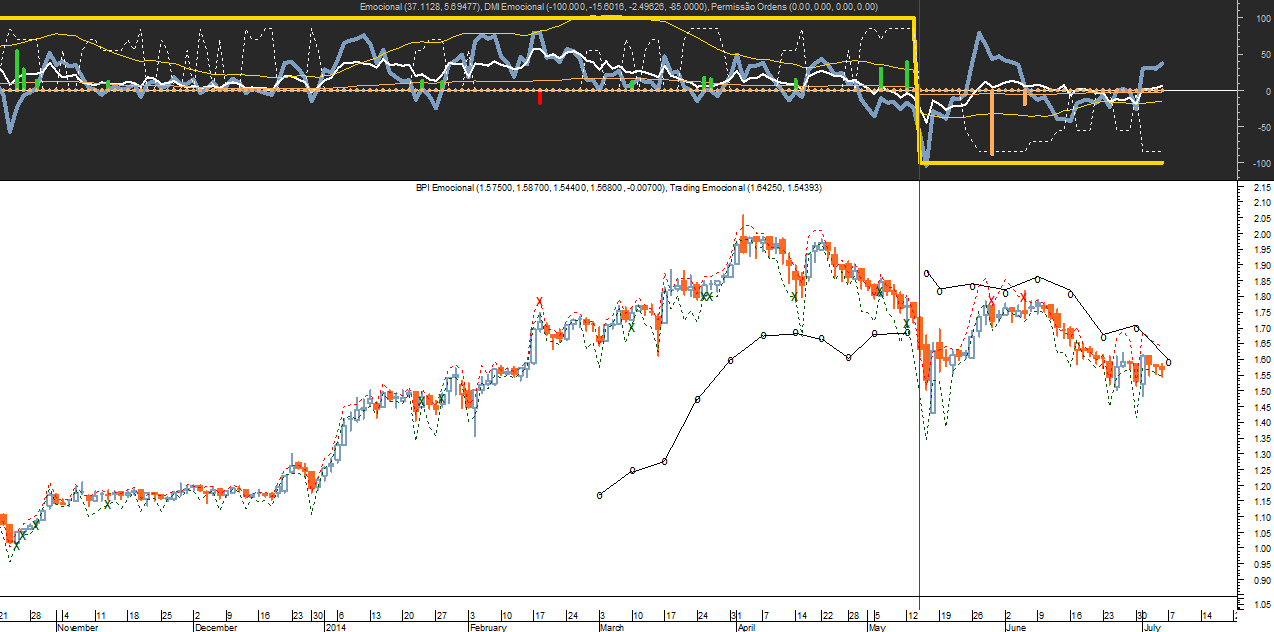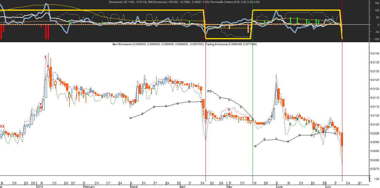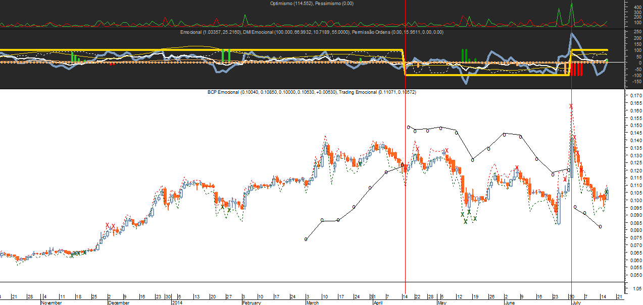 No gráfico de cima aparecem umas pequenas barras a vermelho verticais que vos peço que ignorem por enquanto. Trata-se de um indicador em teste destinado a complementar ordens de venda do tipo oscilatório; se o referido indicador obtiver bons resultados será introduzido no sistema de trading apenas na versão que vai arrancar a partir de 2015.