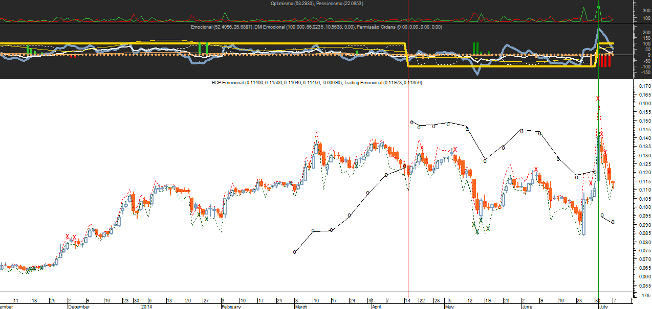 Outra curiosidade interessante neste título reside no rating emocional diário da sessão de hoje. Apesar do BCP ter encerrado percentualmente negativo, o rating diário otimista (ver gráfico de cima em cor verde) ultrapassou o rating diário pessimista (cor vermelha no mesmo gráfico) em +63,3 pontos contra -22,1 pontos, admitindo assim o sistema de trading que os fatores positivos na ótica dos traders ultrapassam os de caráter negativo na sessão terminada, o que se explica pela boa performance do BCP registada na reta final da sessão.