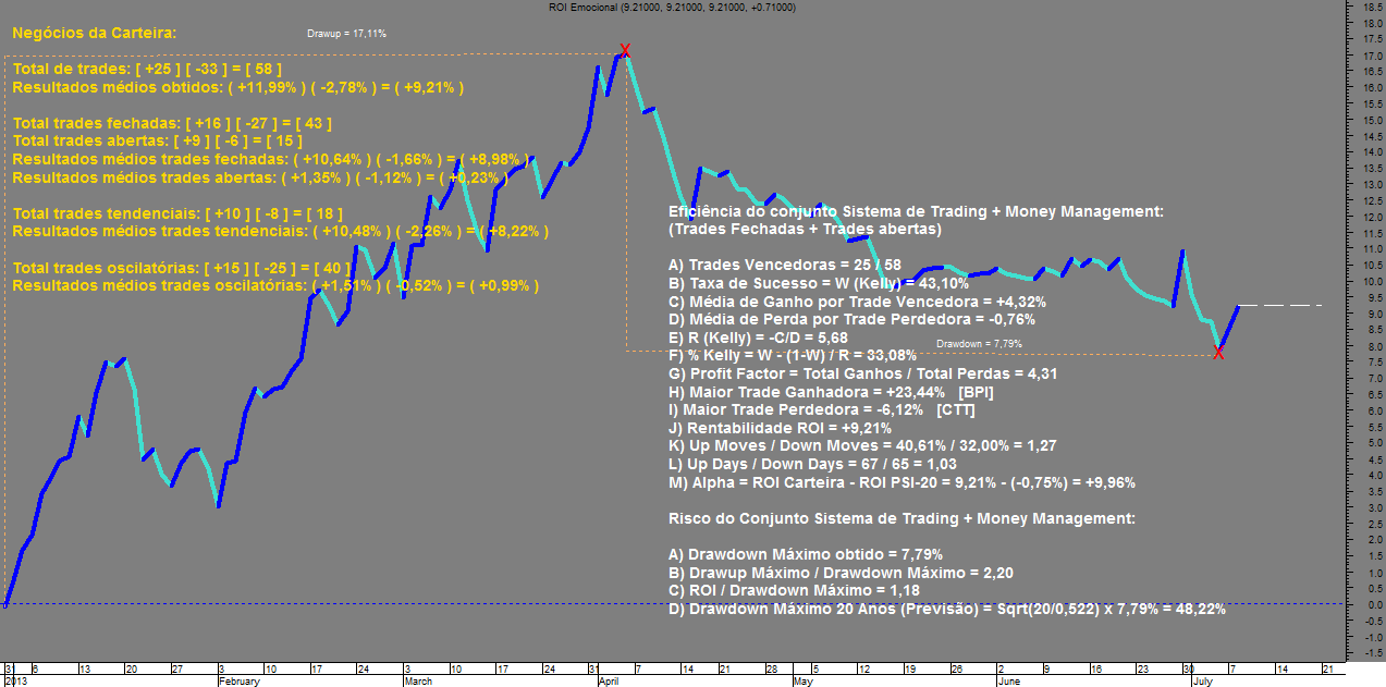 Parece tudo muito simples mas numa primeira constatação pode-se concluir que uma gestão ativa da carteira razoavelmente controlada, com as ferramentas de um sistema de trading adequado, não permite que a carteira, durante os períodos mais negativos do mercado, possa sofrer recuos percentuais ajustados idênticos aos do mercado em geral. Mas há que reconhecer que ainda é cedo para concluirmos que isto vai ser sempre assim, aguardemos por dados e períodos de trading mais extensos no futuro.