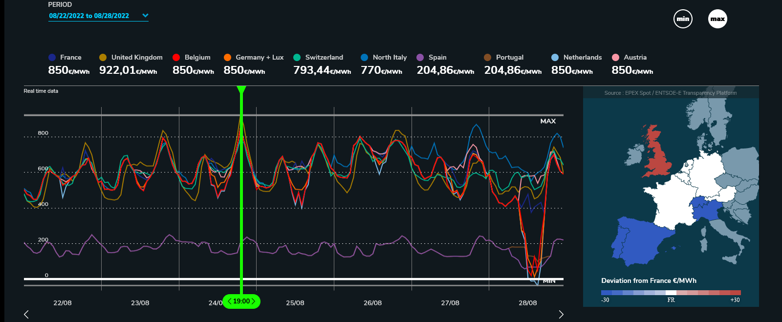 Como se pode verificar no gráfico, o preço da electricidade em França, na ultima semana foi 3 a 4 x mais caro que em Portugal e Espanha.