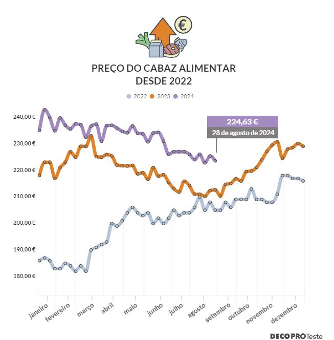 Sublinho que o artigo e os preços são de 2023. O ponto é que, segundo dados da própria DECO, o preço do próprio cabaz pode variar de forma significativa entre diferentes modalidades.