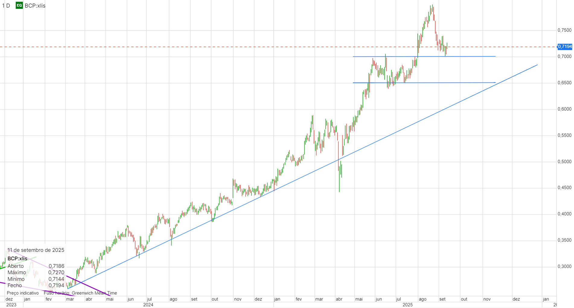 Olhando para o gráfico, se os 0,68/0,70€ segurarem nela, a minha previsão, é que por volta da primeira quinzena de outubro, volte novamente ao caminho que vinha a traçar.