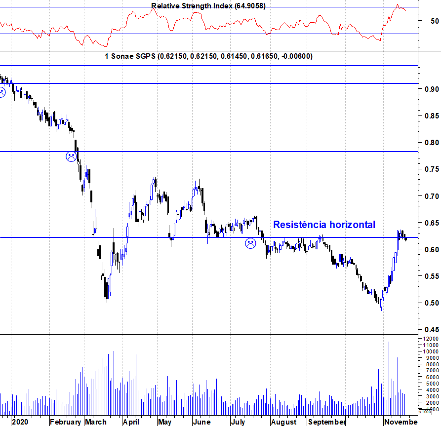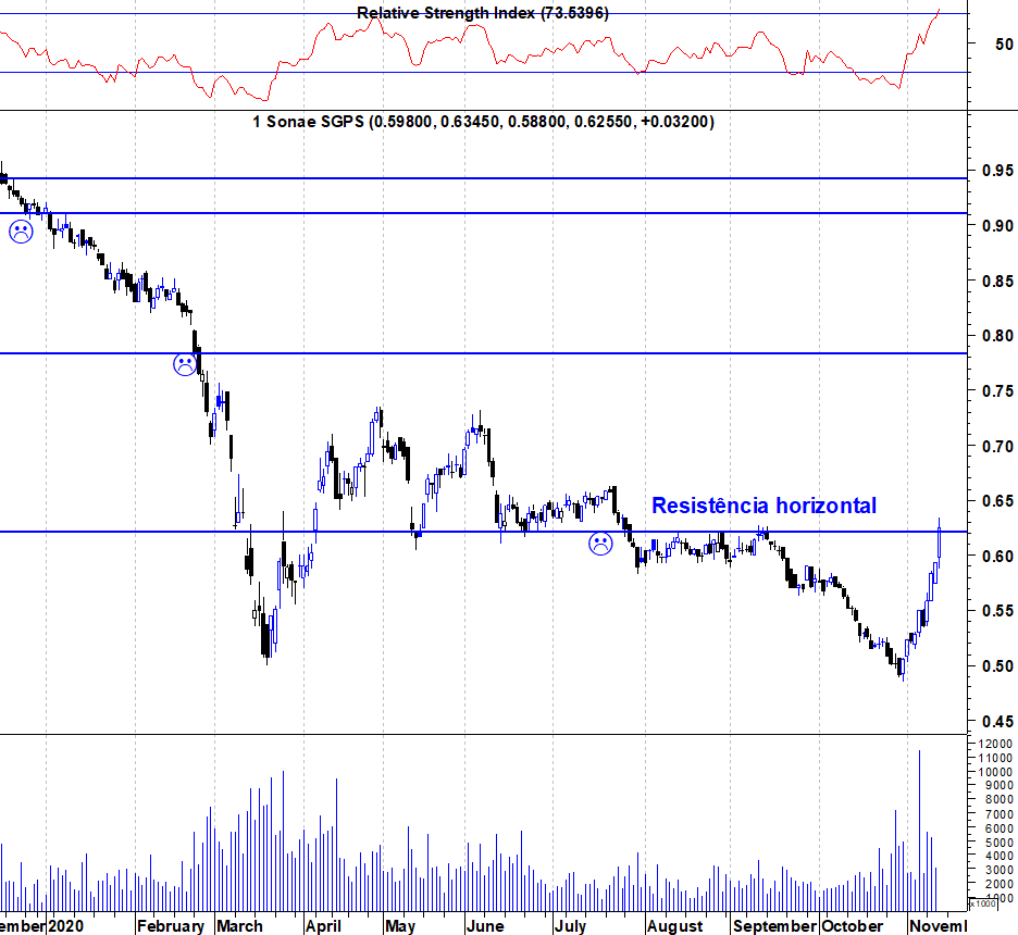 Bem sei que já esta semana actualizei o gráfico da Sonae mas as fortes subidas, a excelente reacção aos resultados e o facto de estas subidas a terem feito colar à sua importante resistência, justifica a actualização do gráfico.