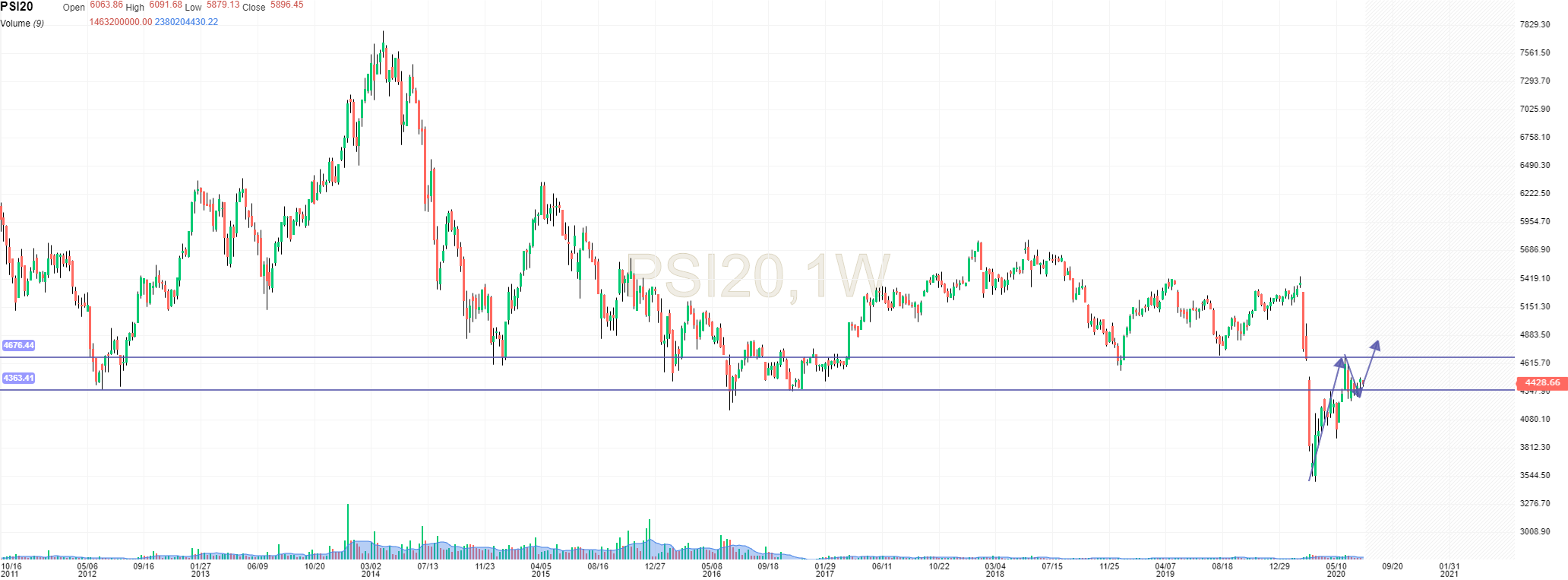 As grandes zonas de suporte e que podem ser consideradas paredes são acima de onde o PSI20 negoceia, sendo assim elas resistências.