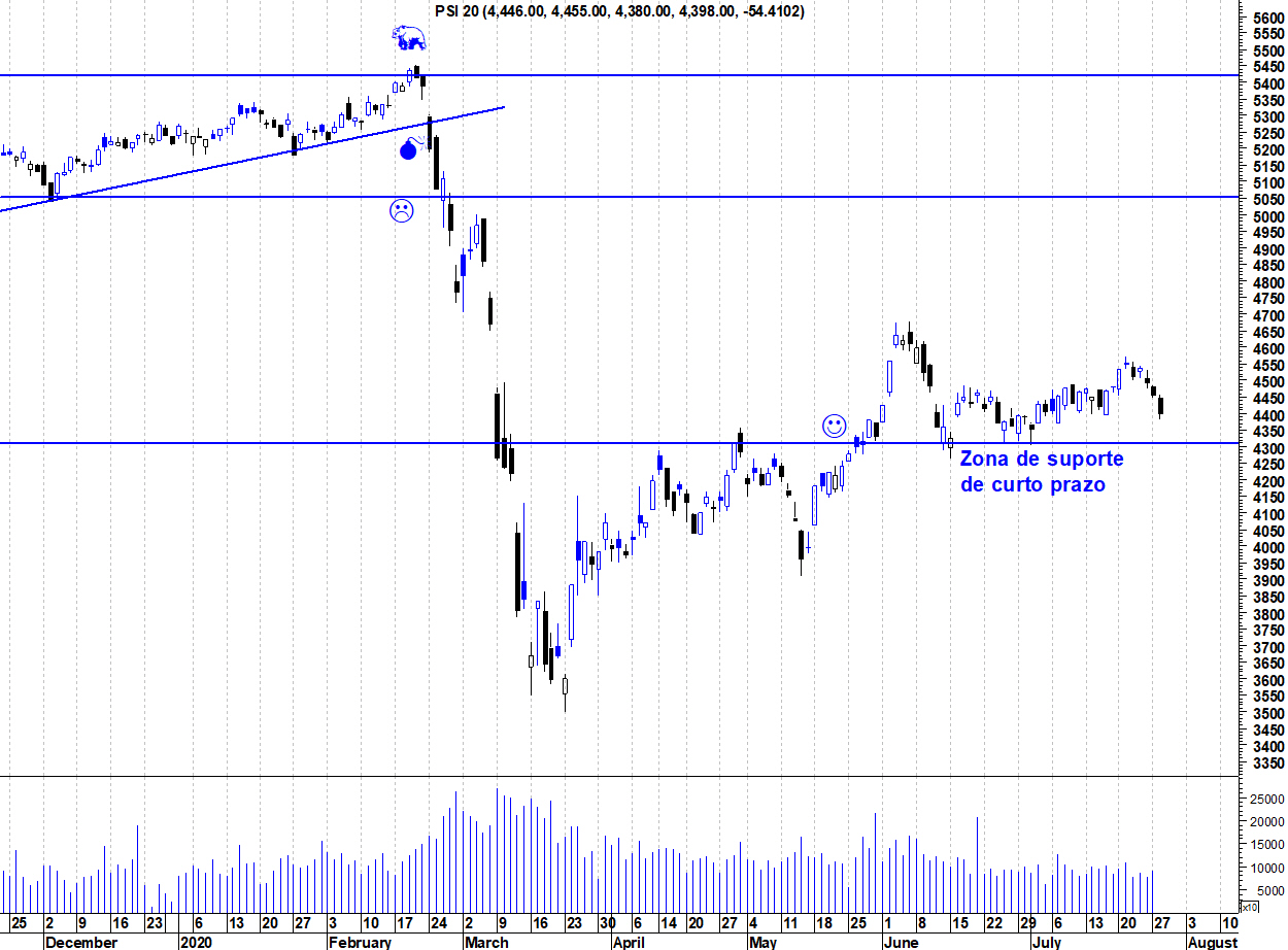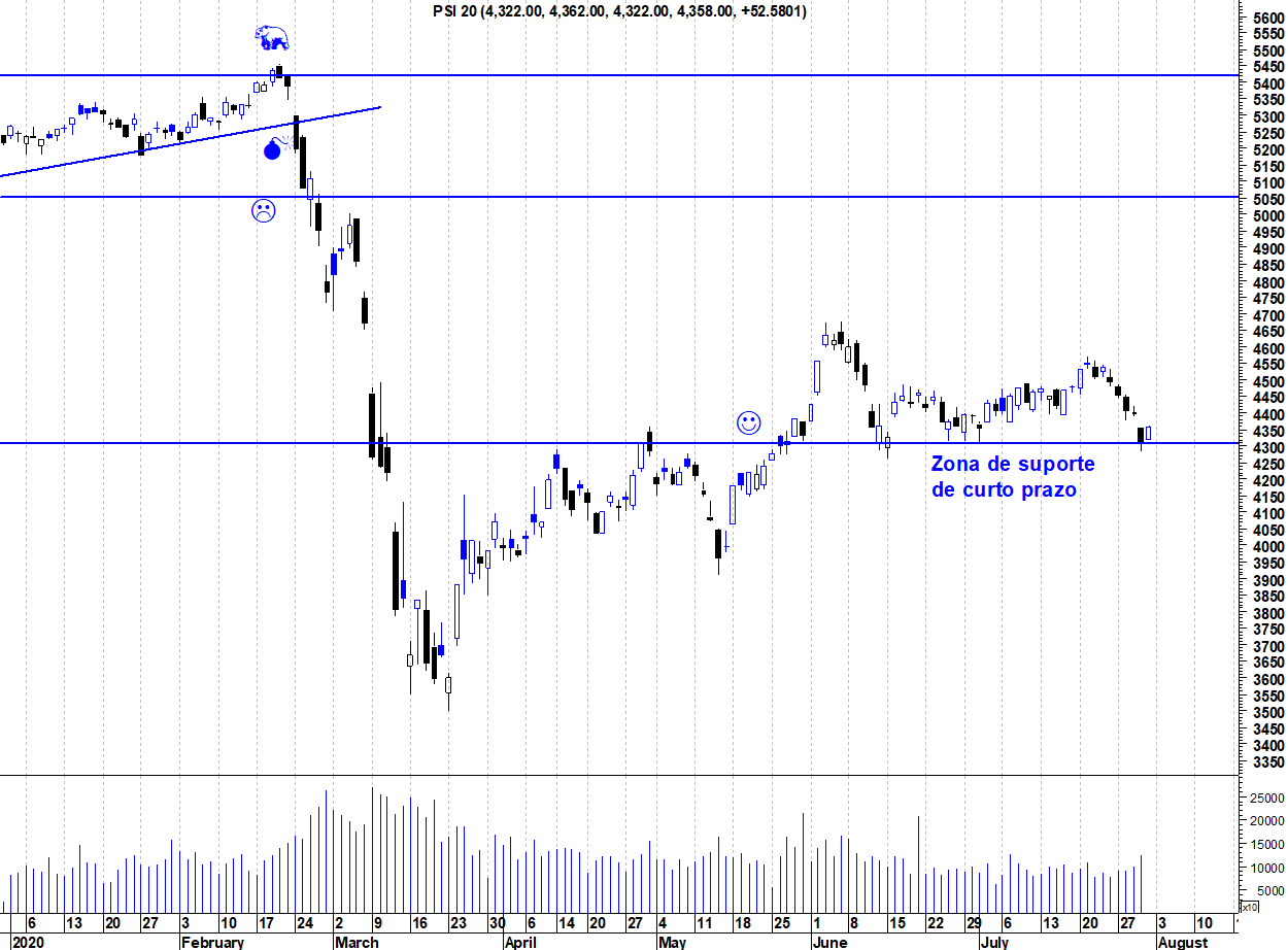 Deixo o gráfico actualizado do PSI onde o suporte dos 4300 pontos continua a ser crucial para manter os touros em jogo.