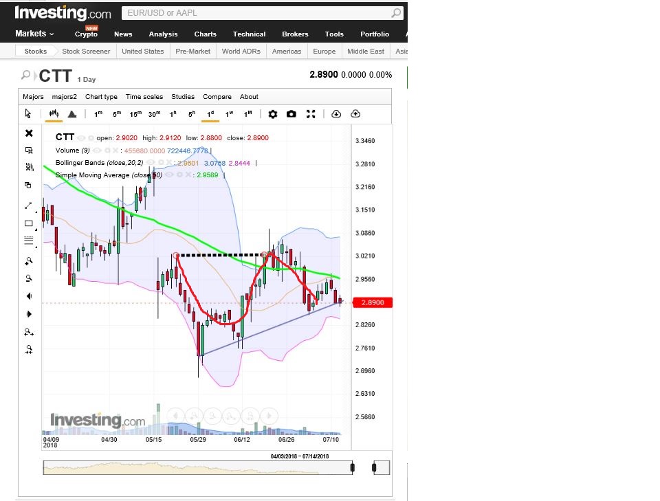 Portanto, um "head and shoulders" pode ser sinal de que uma tendência de subida terá chegado ao fim. Efetivamente a cotação dos CTT tem, digamos, subido desde 29/05/2018. A linha que traço tem início nesse mesmo dia.