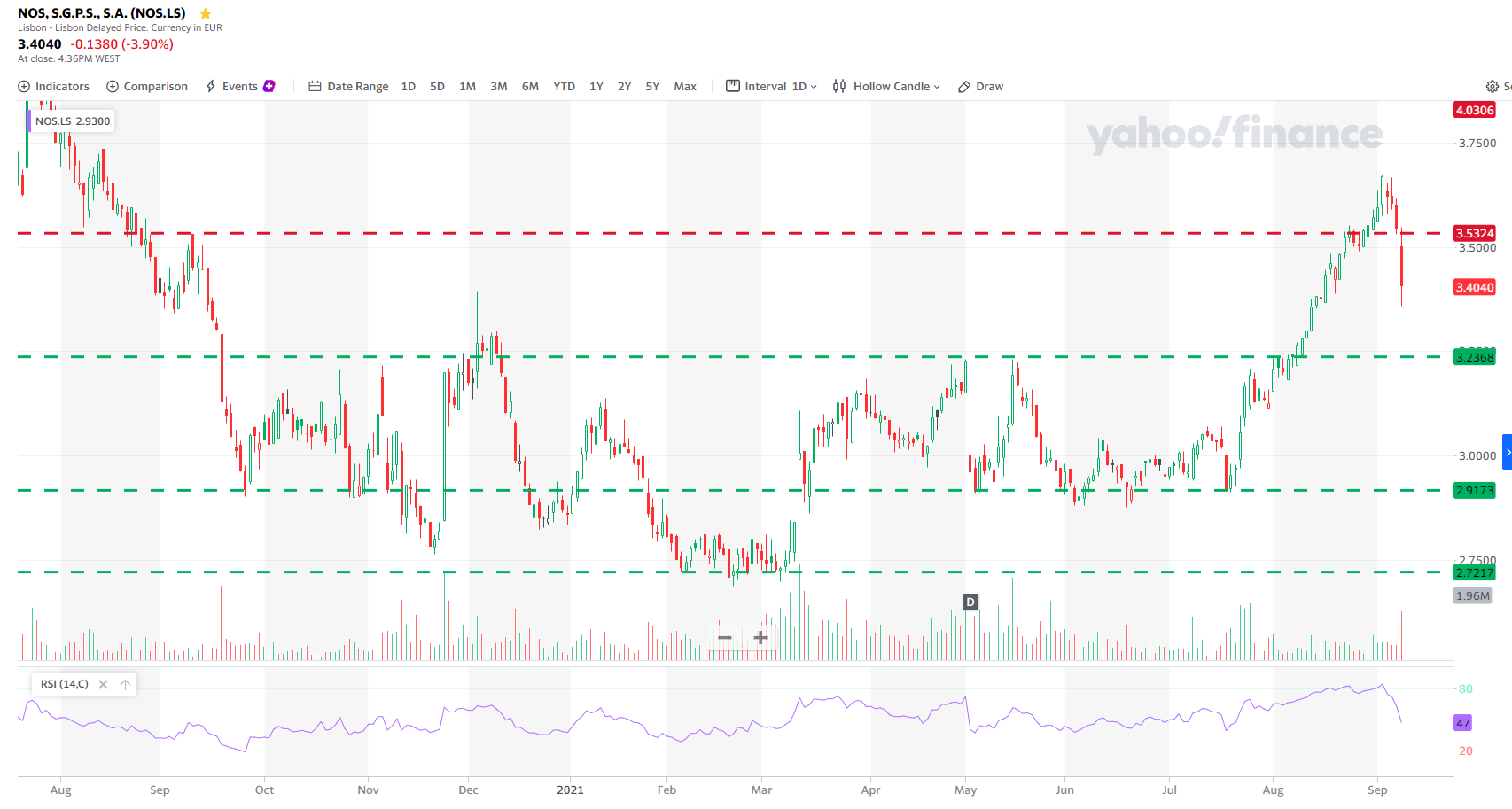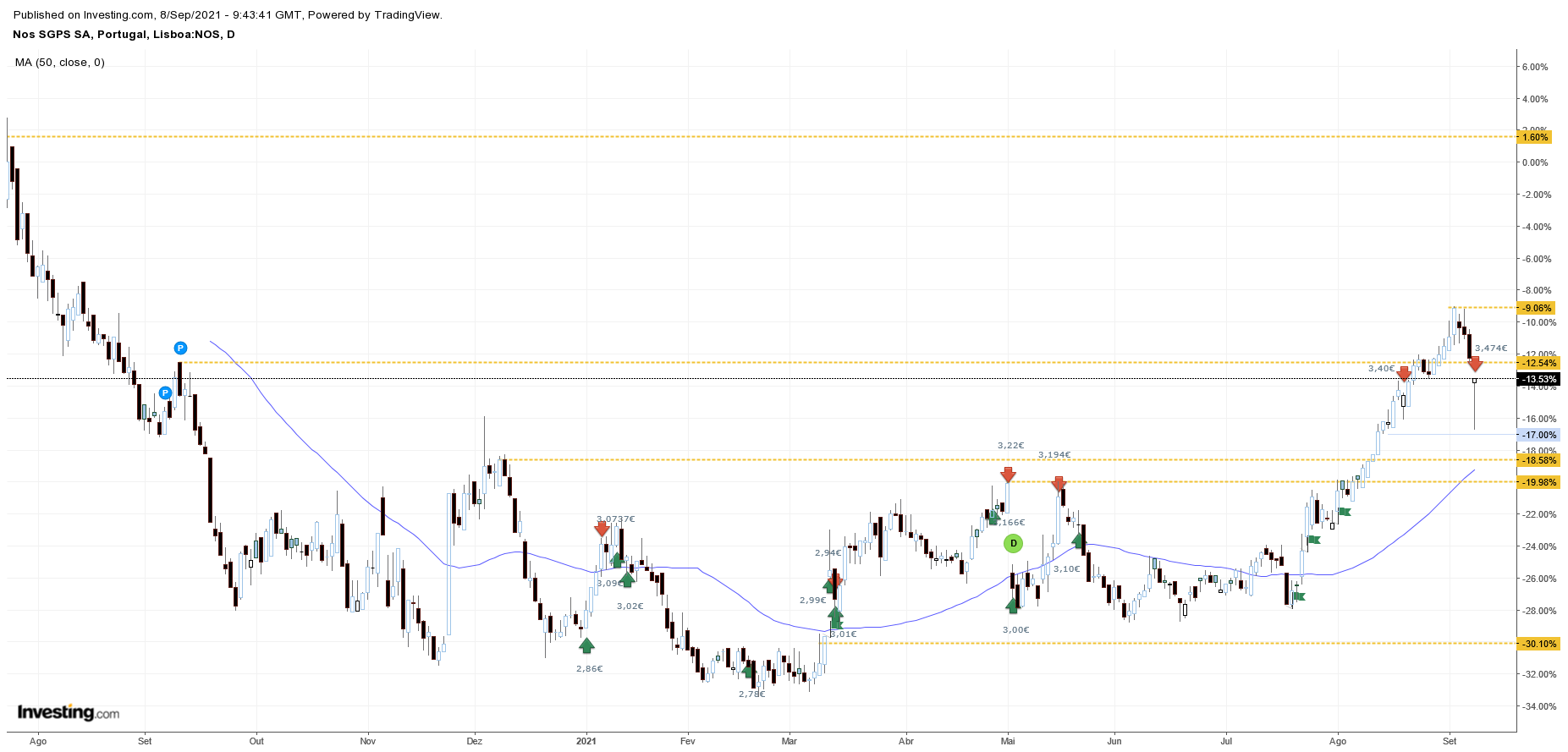 Eu cá vejo a próxima resistência cerca dos 3,24€. E zona seguinte de suporte identifico entre os 2.9 e os 3 €.
