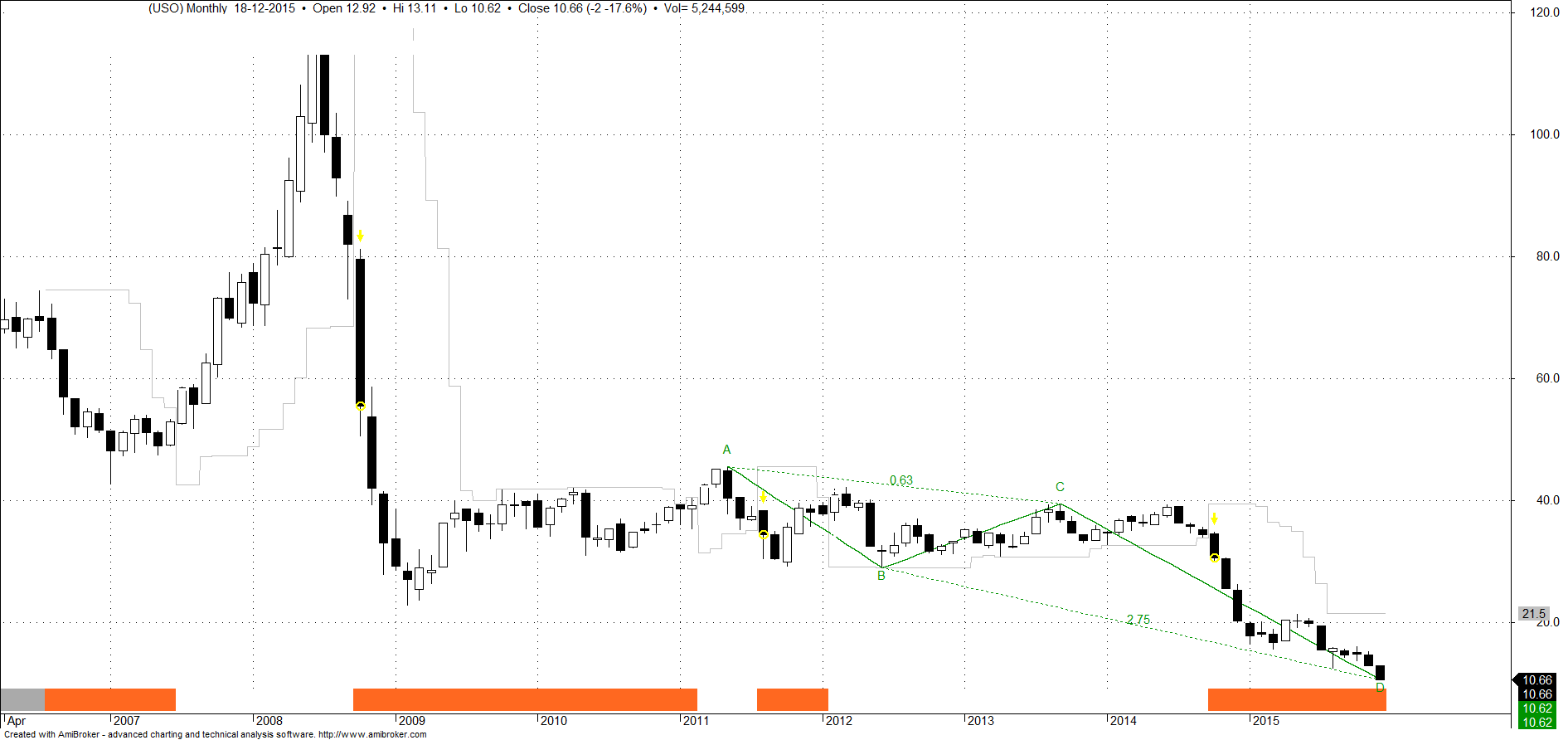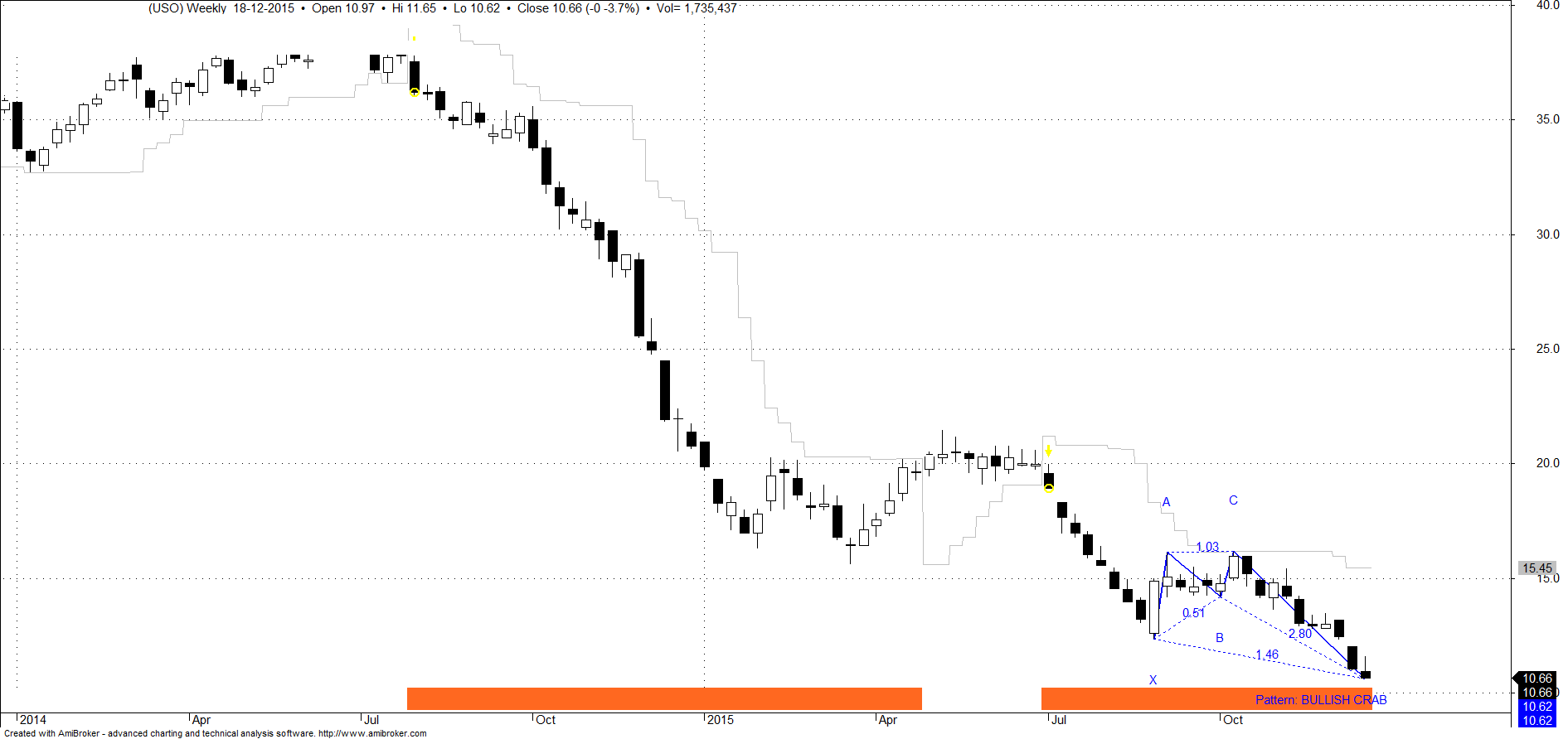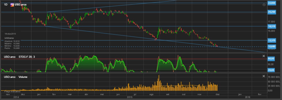 Apesar da tendência (óbvia) de queda e da lógica fundamental apontar para esse reforço, ou seja, aumento de oferta e uma possível estagnação de procura (ou mesmo uma ligeira diminuição), parece-me que a nível de AT (e sou apenas um curioso) há argumentos suficientes para que a probabilidade de um ressalto significativo seja superior a 50%. Decidi fazer uma pequena entrada (cerca de 1,5%) a 10,72 no ETF USO, reconhecendo que tem grande risco a começar por não haver um suporte "natural".