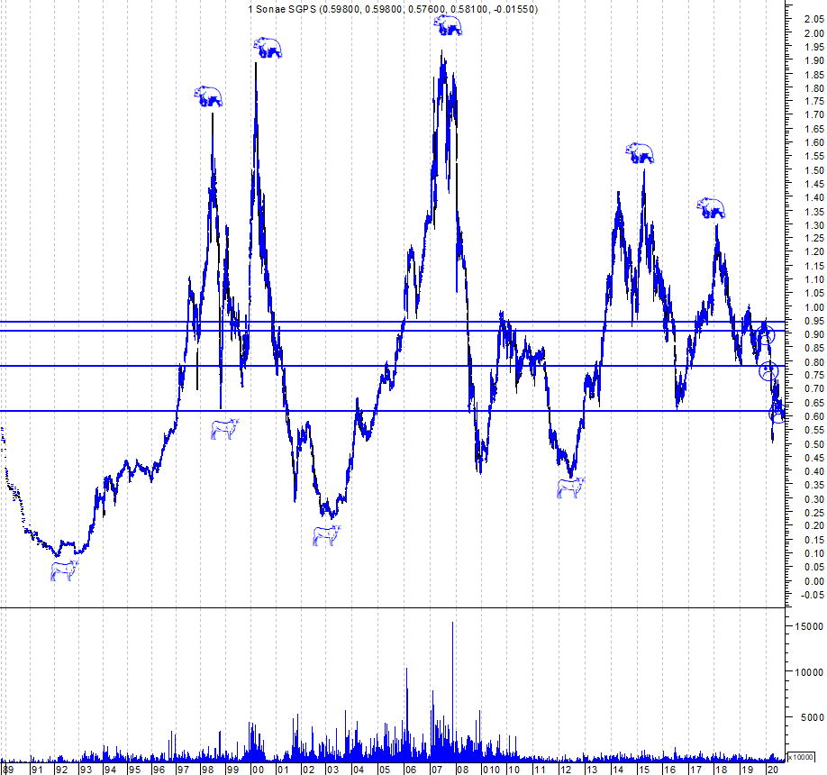 Deixo o gráfico actualizado da Sonae que costuma ser um bom espelho da Bolsa portuguesa. Não há "Bull Markets" do PSI sem "Bull Market" da Sonae. Infelizmente, não têm sido tempos fáceis para a Sonae em Bolsa, como o gráfico bem reflecte.