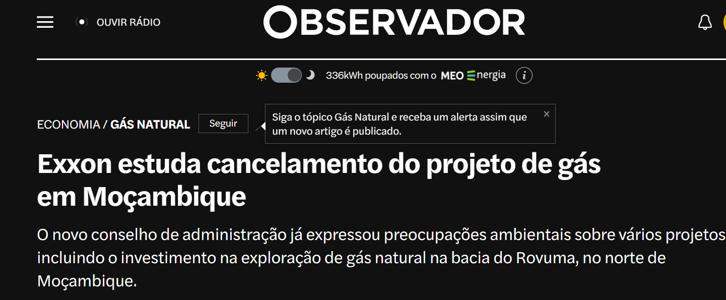 A GALP detém 10% no projeto de exploração de gás na Bacia do Rovuma e há uma grande indefinição sobre o futuro do projeto, muito embora o Presidente da Exxon já tenha vindo a público desmentir a notícia do abandono do projeto do Rovuna.