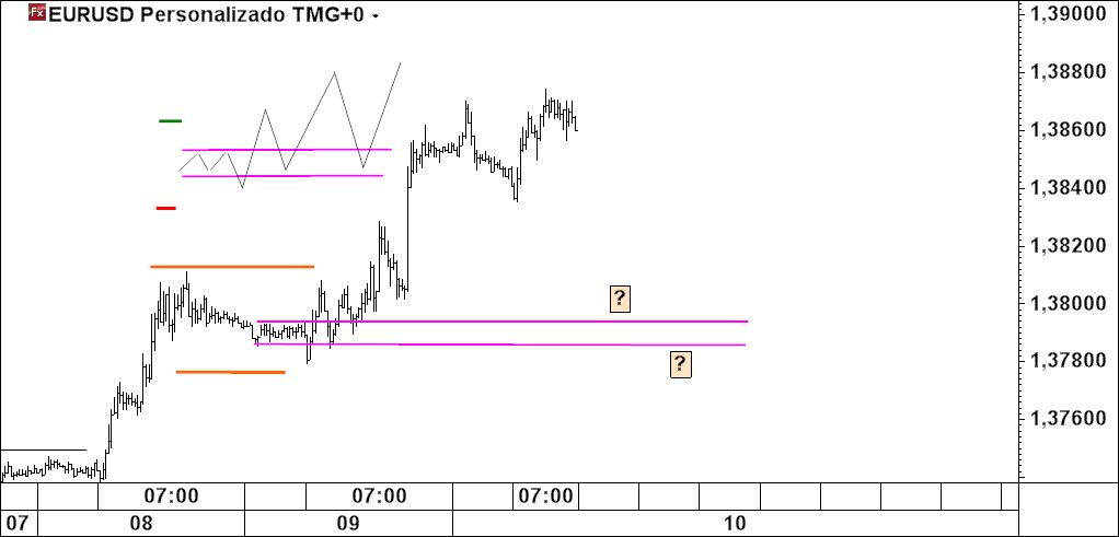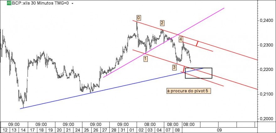 no 1.º gráfico a linha ascendente de cor rosa (linha de máxima excursão, cuja violação deu origem à presente correcção) constituirá íman, caso o preço mantenha aquela tendência