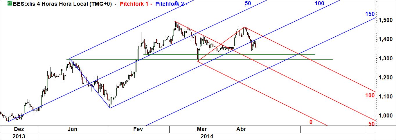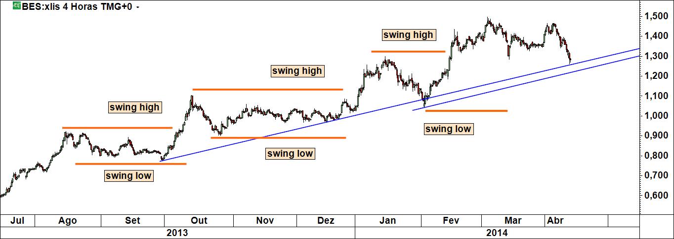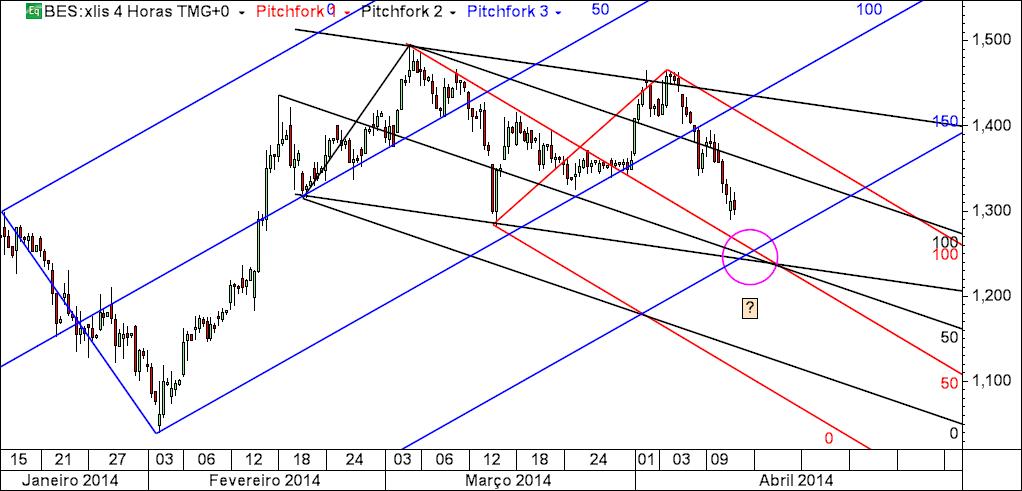 Se eu estou a ver bem o filme o BES, na escala das 4h, está já a fazer lower highs e lower lows, logo, como aliás mostram bem as linhas mestras que traçaste, tens de lidar já nesta timeframe com uma downtrend.