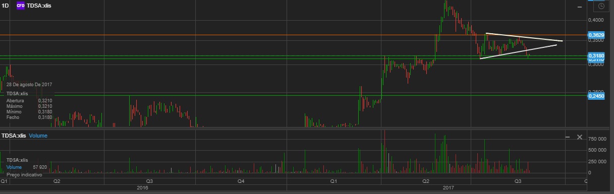 Bem, quebrou o triangulo em baixa, mas reagiu bem ao suporte na sexta-feira. Vamos ver como corre esta semana, mas se furar o suporte é bem capaz de pelo menos ir lá abaixo à zona dos 0.245€.