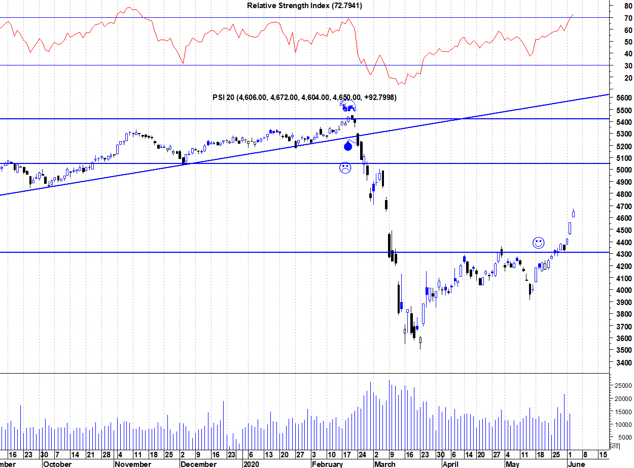 O DJ já recuperou quase a totalidade da correção covid19 (pullback) e o psi engasgou nos 4600, vai a meio