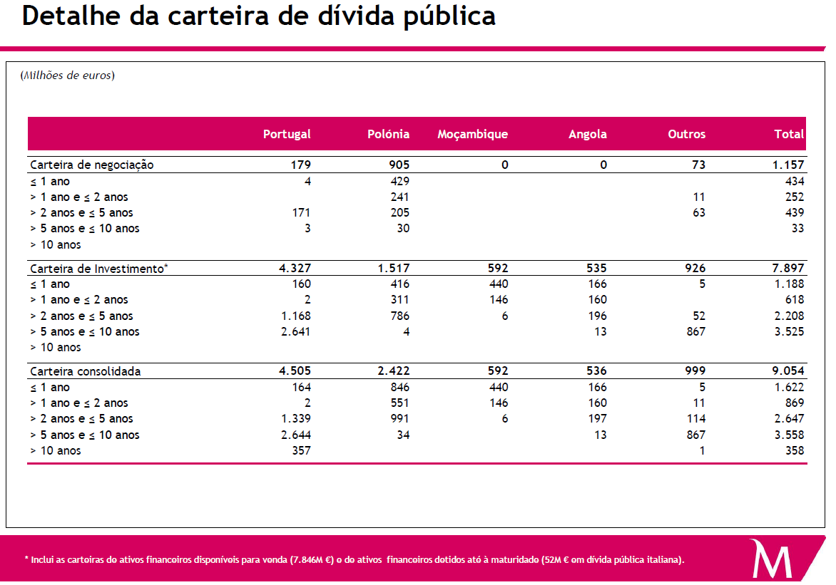 investpouco Escreveu:alguem me sabe dizer quanta divida publica ainda é detida pelo BCP? seria optimo termos uma ideia para saber possiveis mais valias caso o BCP se desfaça dela, claro que nao sabemos quando a contraiu mas de certeza que foi muito acima destes niveis actuais.