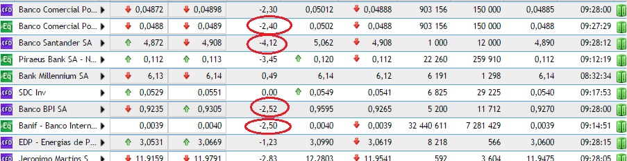 hoje estao em queda os 4 bancos, bcp bpi santander e banif, mas o mais curioso é que neste momento o bcp é o que tem queda inferior.