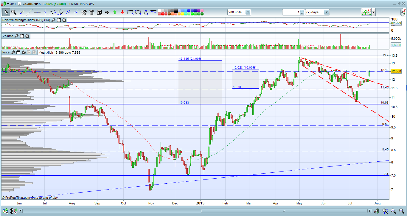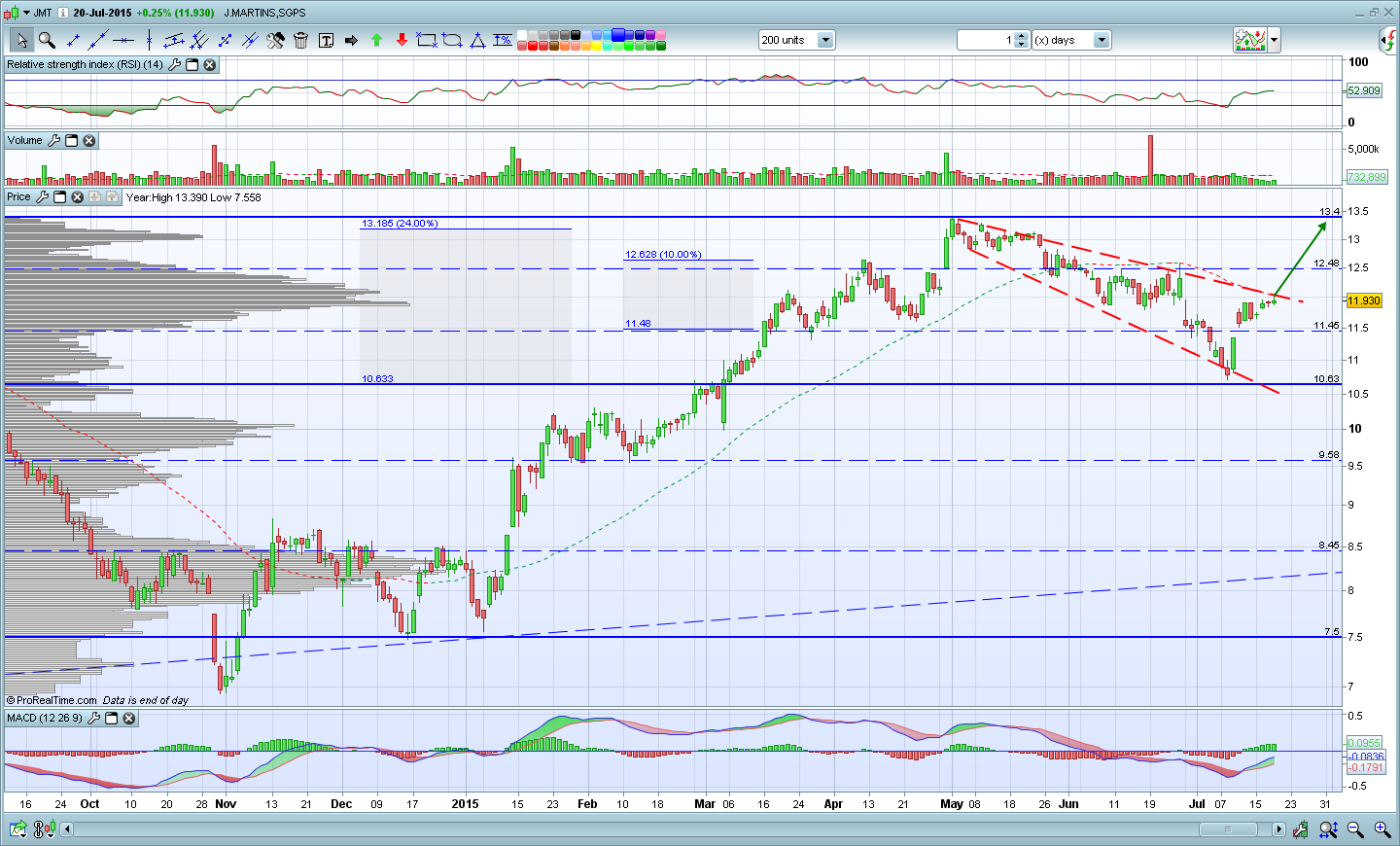 E segue serena a JMT. Parece estar a consolidar nestes valores, sobe um dia, volta a descer, cai um dia, volta a subir, sem grande volume, nada de especial, muito provavelmente um movimento saudável de uma ação que subiu bastante nos últimos meses. Provavelmente até nem será um mau range de preços para proceder a um reforço da posição para quem está dentro há algum tempo(estou a ponderar fazê-lo). A nível técnico penso que mantém a longo/médio prazo o seu caminho de alta.