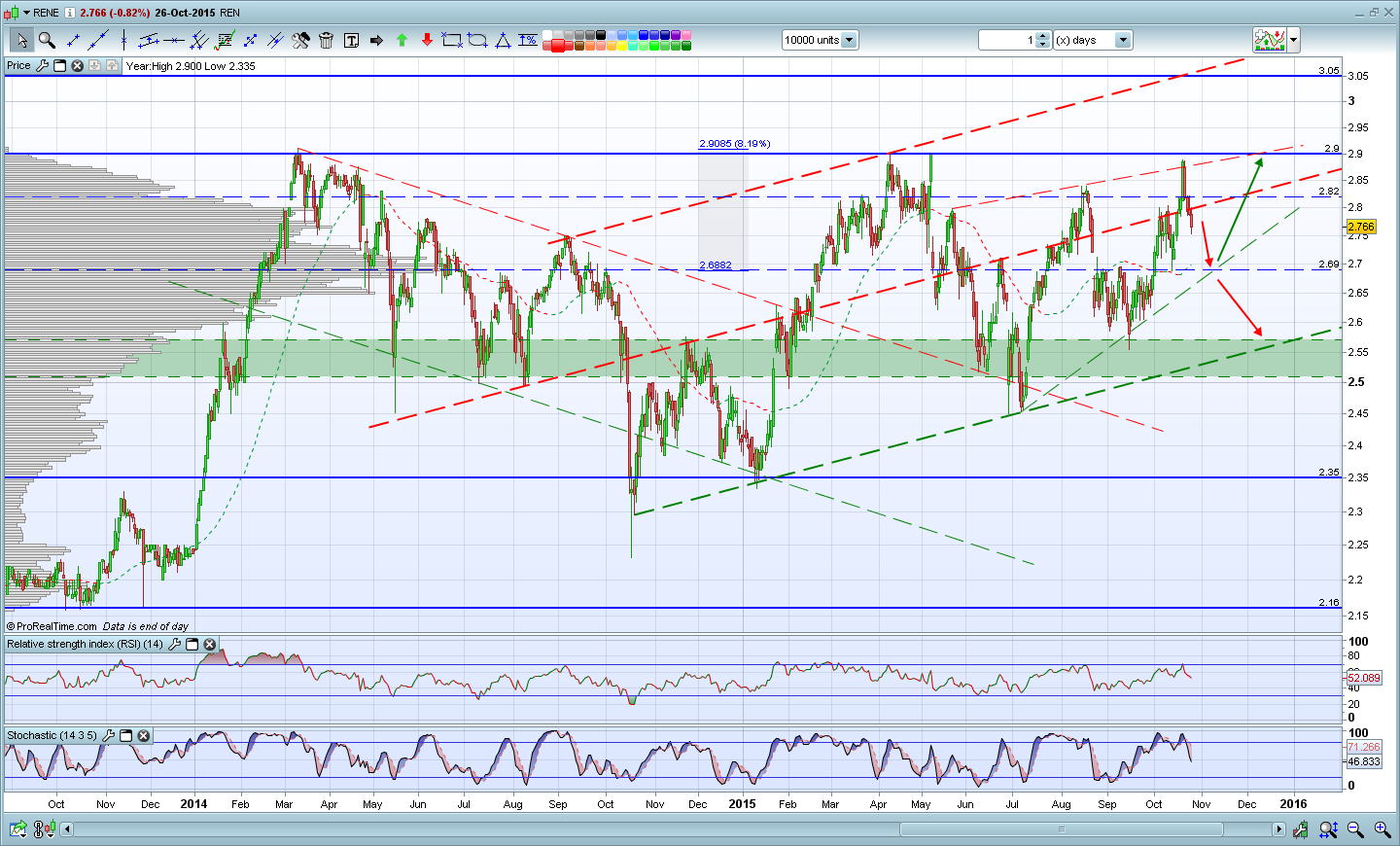 Deixo-te aqui os gráficos actualizados da Ren mas é daqueles gráficos que não consigo dizer nada sobre a acção, nem sequer se está bullish ou bearish. No dia em que quebrar os limites do intervalo 2,35/2,9 pode ter um movimento sólido para o lado em que quebrar mas, actualmente, é daqueles gráficos que digo: Passo.