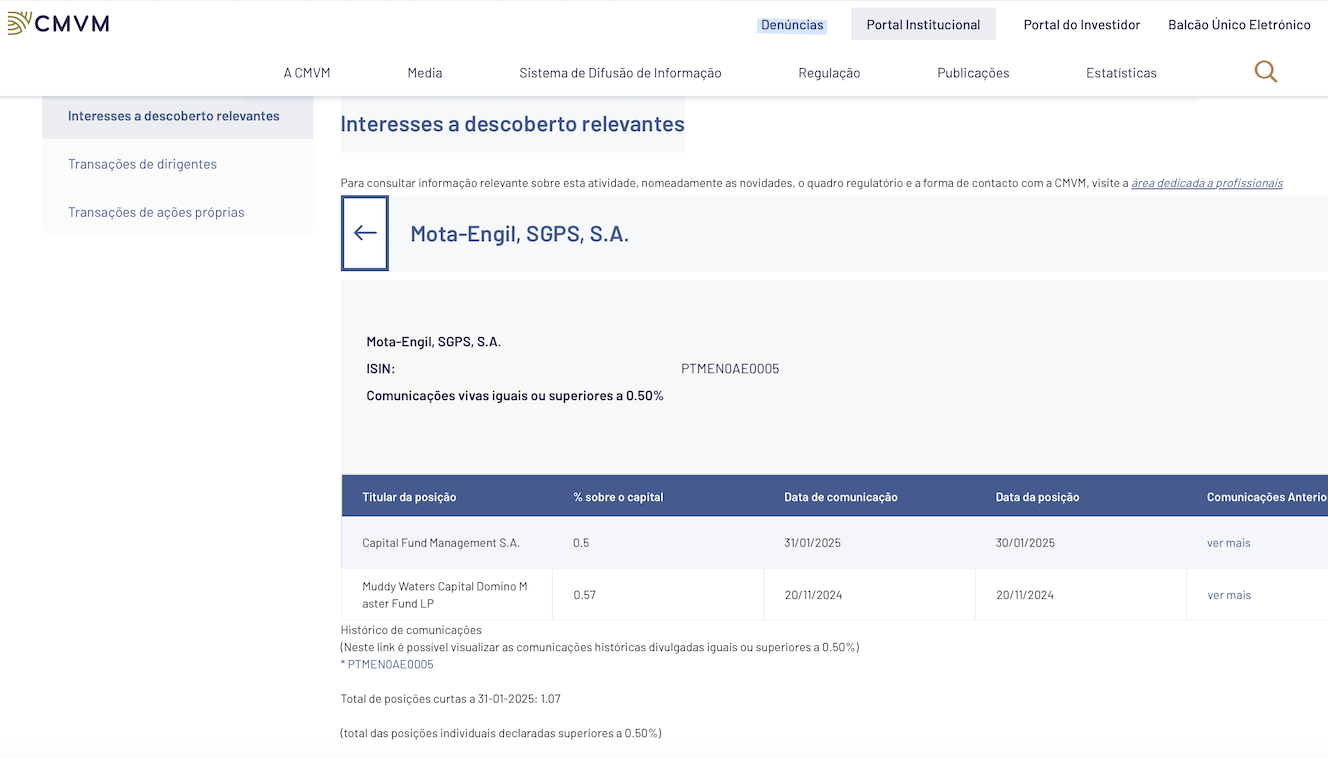 - A comunicação da posição à CMVM é datada de hoje, sendo que a data da posição é de dia 30/01/2025, ou seja, a interpretação de um leigo seria que a "Capital Fund Management S.A." teria adquirido uma posição curta equivalente a 0,5% do capital em bolsa da Mota-Engil no dia de ontem.