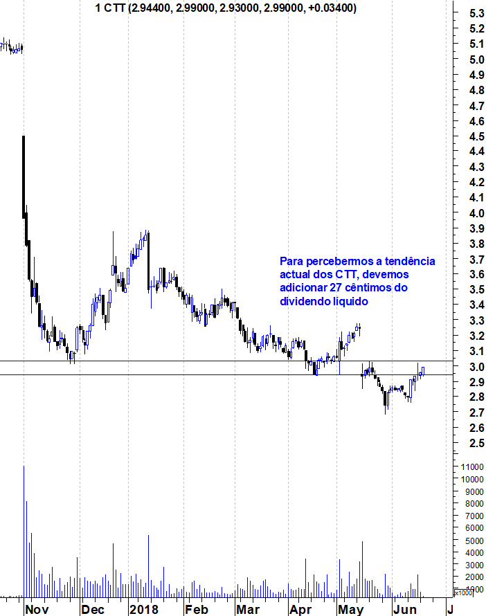 Somando o valor do dividendo líquido, os CTT já estão acima do valor do dia ex-dividendo e em máximos dos últimos 3 meses.