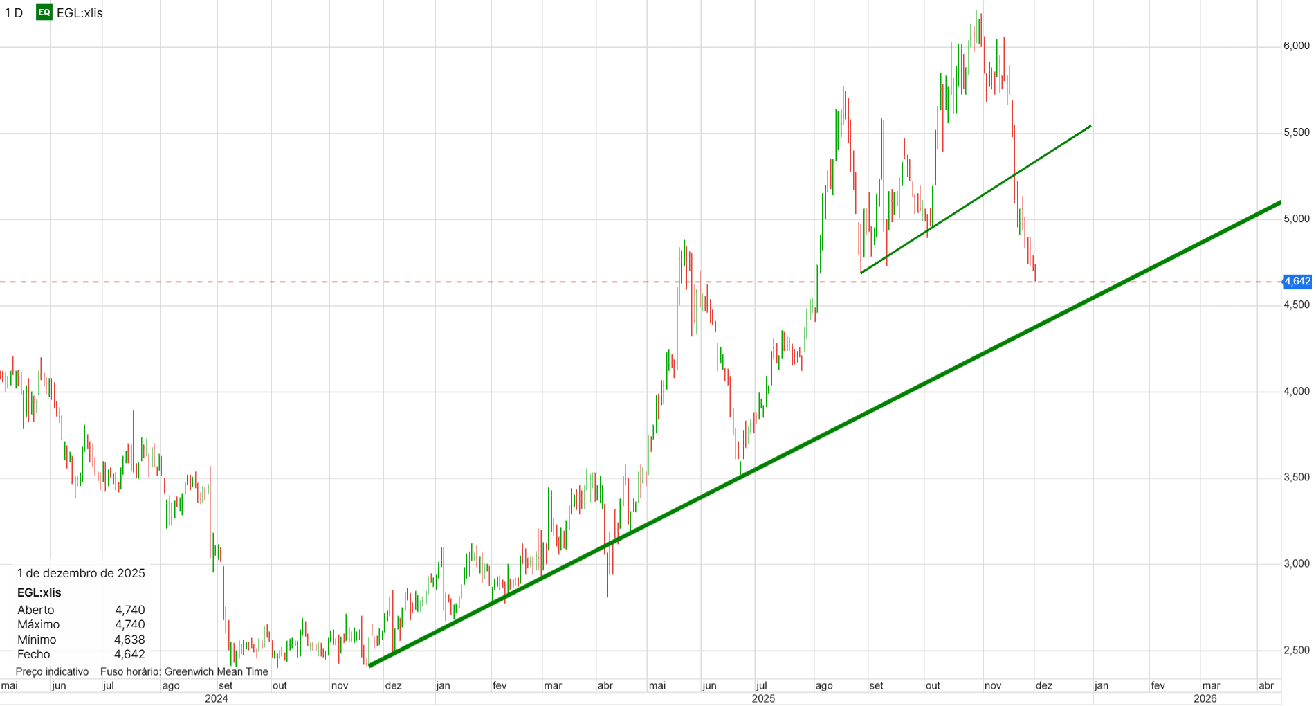 Luís, isso só acontece até o preço tocar a diagonal ascendente. Um pouco mais abaixo. No intervalo 4.6-4.5.