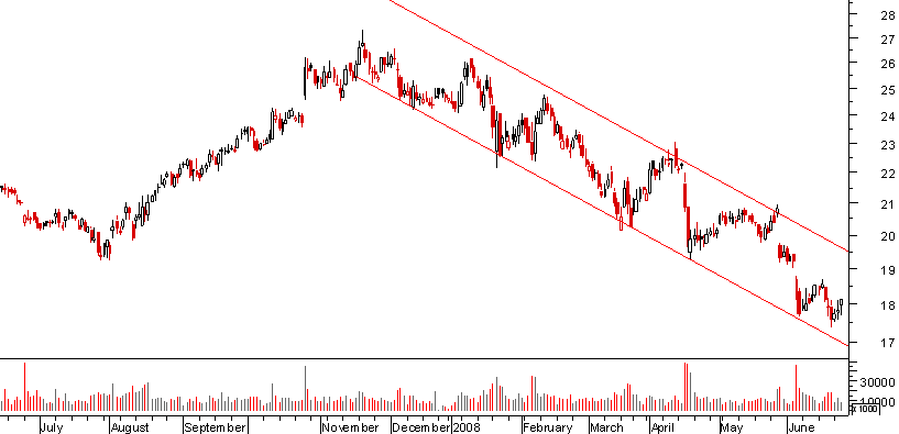 ao contrário da maioria dos gráficos que formam um arco entre março e agora, esta telecom vem por aí abaixo ao longo de um bem definido canal
