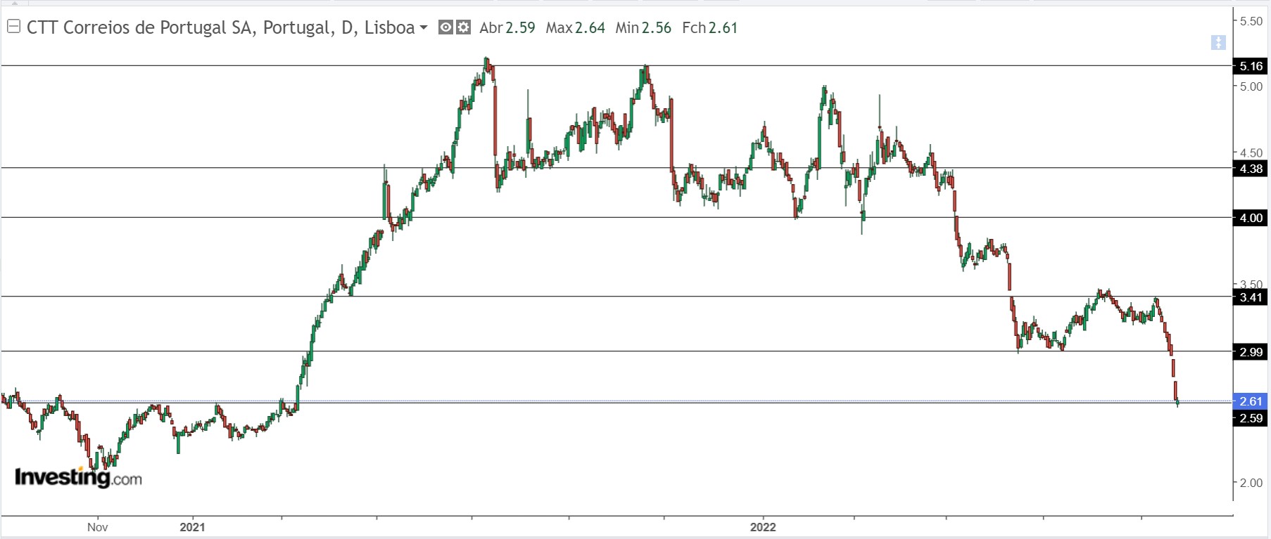 O CTT continua com a sua tendência descendente, tendo acentuado as quedas no decorrer deste mês.