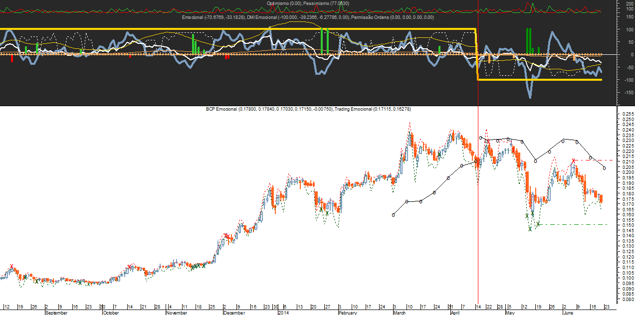 Aí pode-se observar que o título mantém um pendor de volatilidade a baixar (linha amarela fina a convergir para a linha de zero), pelo que o cenário mais provável neste Banco será o de poder formar no médio/longo prazo uma “flag” entre os valores dos últimos preços de trading oscilatório calculados pelo programa: topo nos 0,212 e base nos 0,151.