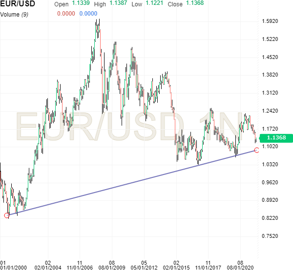O EUR/USD volta ali à casa de 1.12xx, mas está tudo muito duvidoso após um ano negativo para a moeda única. Vou até recuperar um gráfico de 20 anos que deixei no tópico dedicado a 2022, onde se vê uma super linha de defesa para as quedas do par.
