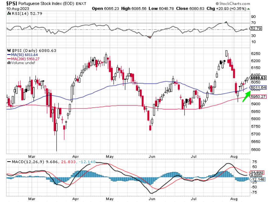 O PSI 20 desceu sexta e hoje, mas a queda total foi inferior a 1%. Foi uma descida pequena. Acho que o ponto importante foi a reação pela terceira vez num curto espaço de tempo à linha da MA200. Parece que há pessoas e ou instituições com bastante dinheiro a comprar para evitar que o PSI 20 caia abaixo da MA200. Quanto ao Nasdaq e ao S&P 500, também estão próximos da linha da MA50, que anteriormente funcionou como suporte. No entanto, vamos ver o que vai acontecer esta semana.