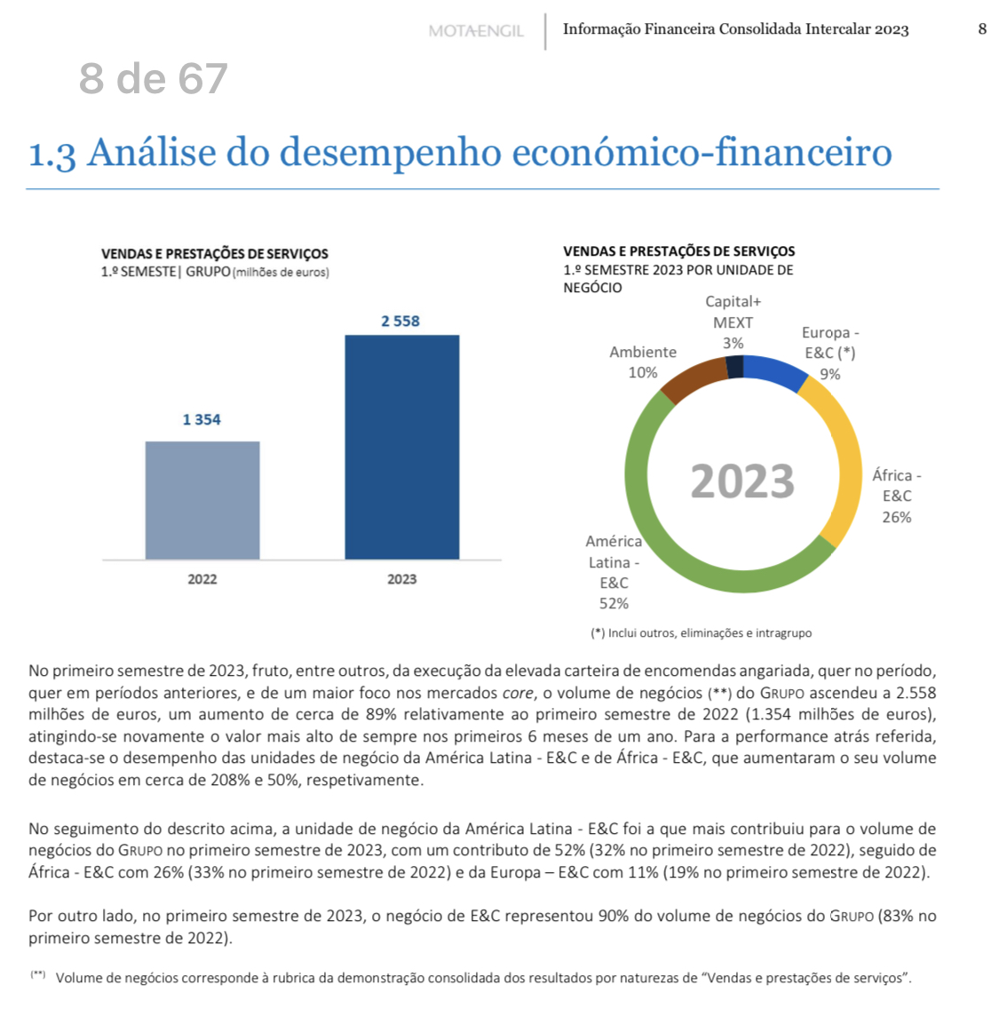 …..“No primeiro semestre de 2023, fruto, entre outros, da execução da elevada carteira de encomendas angariada, quer no período, quer em períodos anteriores, e de um maior foco nos mercados core, o volume de negócios (**) do GRUPO ascendeu a 2.558 milhões de euros, um aumento de cerca de 89% relativamente ao primeiro semestre de 2022 (1.354 milhões de euros), atingindo-se novamente o valor mais alto de sempre nos primeiros 6 meses de um ano. Para a performance atrás referida, destaca-se o desempenho das unidades de negócio da América Latina - E&C e de África - E&C, que aumentaram o seu volume de negócios em cerca de 208% e 50%, respetivamente.