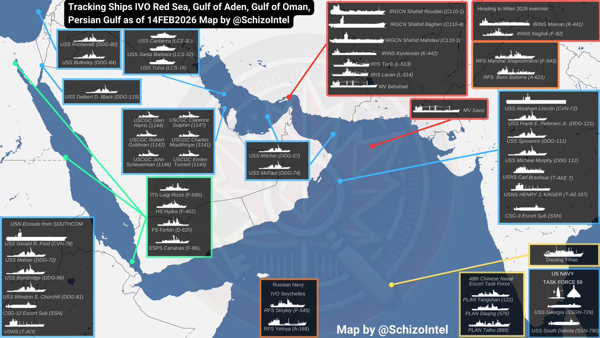 14FEB2026 Updated map of warships operating in Red Sea, Gulf of Oman, Gulf of Aden, Persian Gulf, Arabian Sea.
