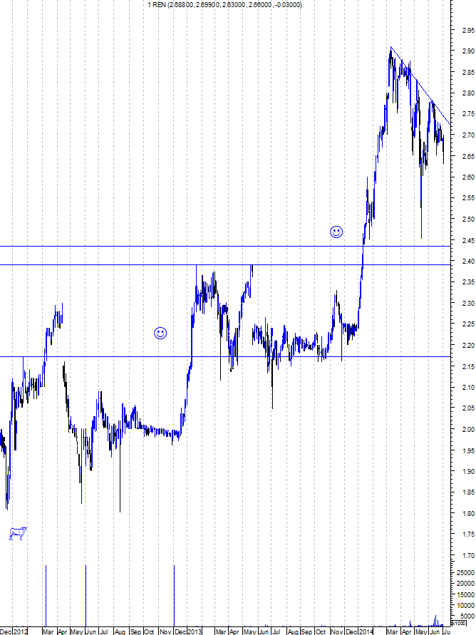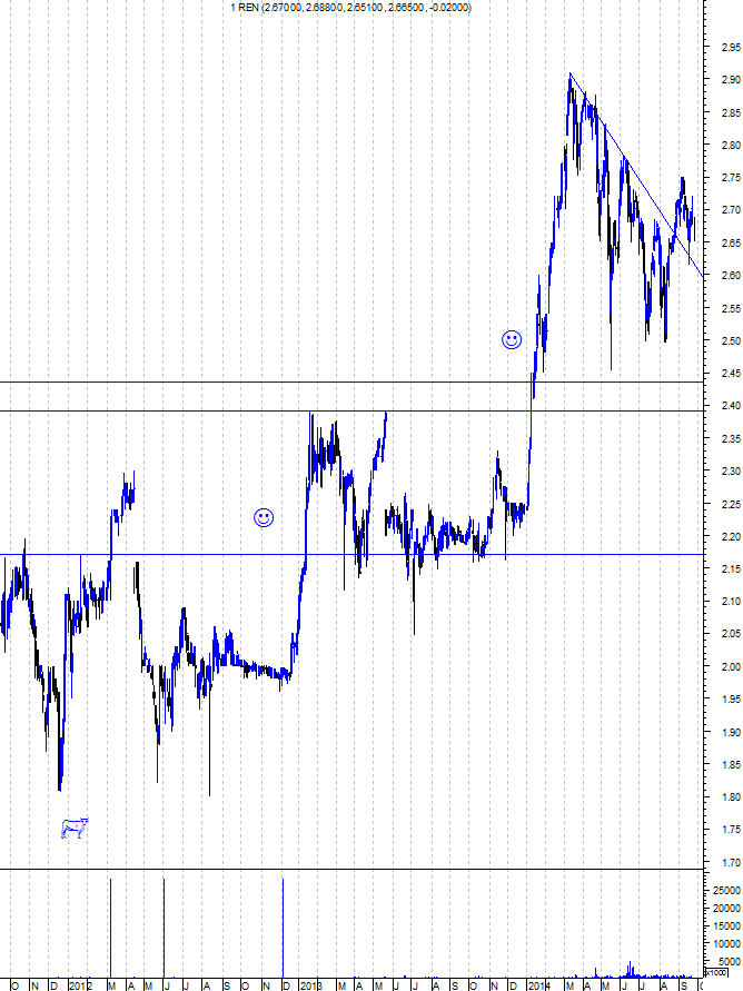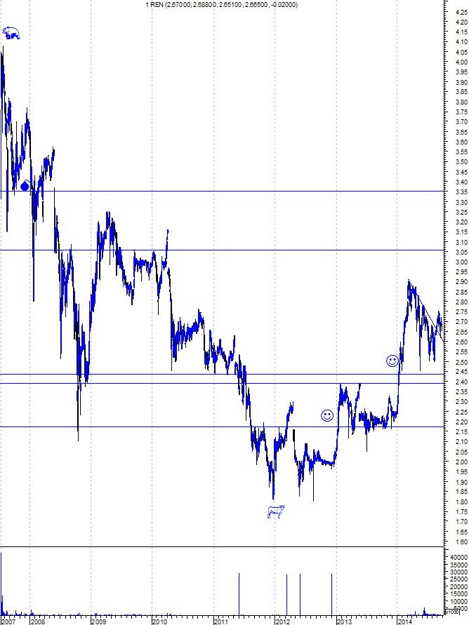 Não é por isso de estranhar que os anos seguintes tenham sido anos de perdas para quem investiu na Ren, pois apenas em 2012 o título inverteu essa tendência de quedas. Tal como tem acontecido com a generalidade das acções portuguesas, desde Fevereiro deste ano que as quedas têm marcado a generalidade dos dias da Ren. Apesar disso, a acção tem conseguido aguentar-se acima da importante zona de suporte entre os 2,37 e os 2,43 euros.
