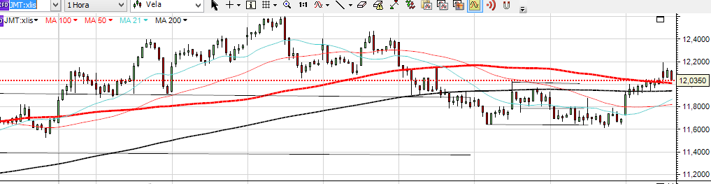 gráfico semanal: vemos que fez um max nos 12 ,65 +/- zona de forte resistência) e desde ai tem reagido em baixa fez uma vela vermelha fechando nos 11,80,no inicio desta semana abriu mais ou menos no mesmo valor tendo atingido o max nos 12,07 tendo ai reagido em baixa estando agora a testar suporte de curto prazo (gráfico 4h) : vê-se que o preço esta a testar os mínimos semanais feitos na segunda mas isso já toda a gente vê no gráfico ok,o que esperar então para quinta e sexta. sabendo que o preço reagiu em baixa toda semana e estando sobre um suporte vai-se ao gráfico de 1h e ver a posição do preço sabendo sempre que é um time com mt ruido e vai valer o vale, mas ai vemos o que o preço nos pode auxiliar e vemos teste ao suporte se ai reagir em alta vemos que tenos como resistência os 11,80 caso os quebre em alta vemos que a zona dos 11,97-12.07,se chegar ai a esses valores a
