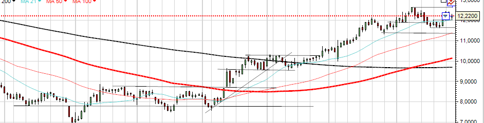 Adam hedge Escreveu:fechado a 11,87 acho que vai por ai acima,o suporte mostrou-se forte e é capaz de ir outra vez aos 12,50