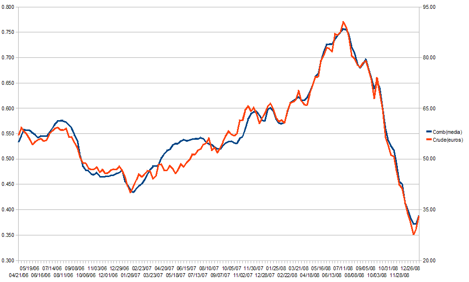 Valores médios semanais do petroleo em euros e entre parentisis o preço da gasolina e gasoleo na semana seguinte.