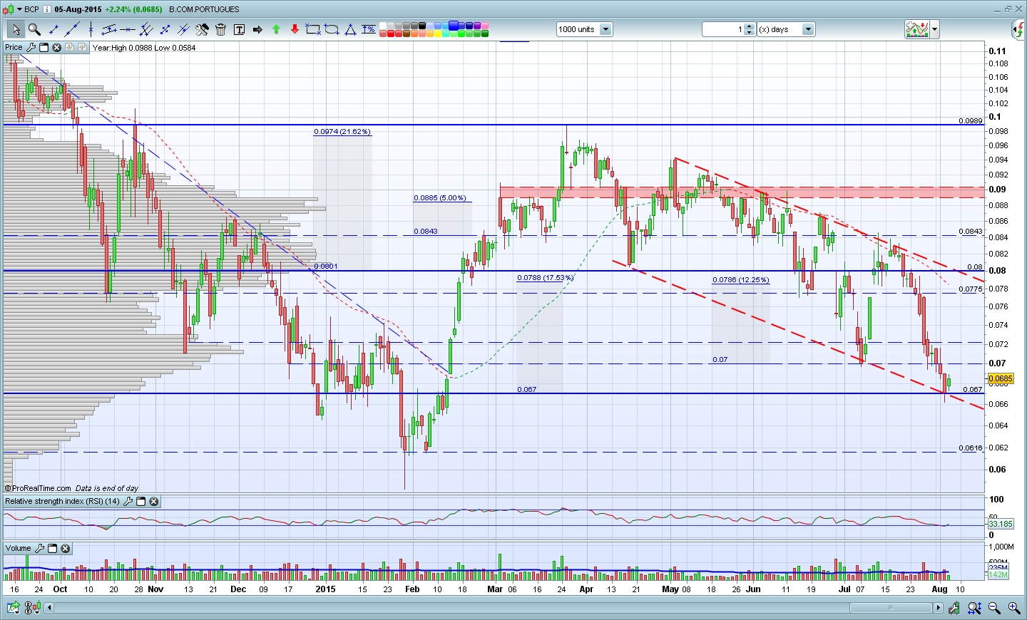 Caro Ramircio, as duas linhas vermelhas a tracejado que o Richardmag desenhou são o canal descendente. São duas linhas que definem os limites onde o preço se mantém durante um período de tempo, neste caso numa tendência descendente. Para que tenha validade precisa normalmente de três toques. Define uma tendência de médio/longo prazo e momentos de entrada ou saída, consoante o comportamento do preço ao toque das linhas.